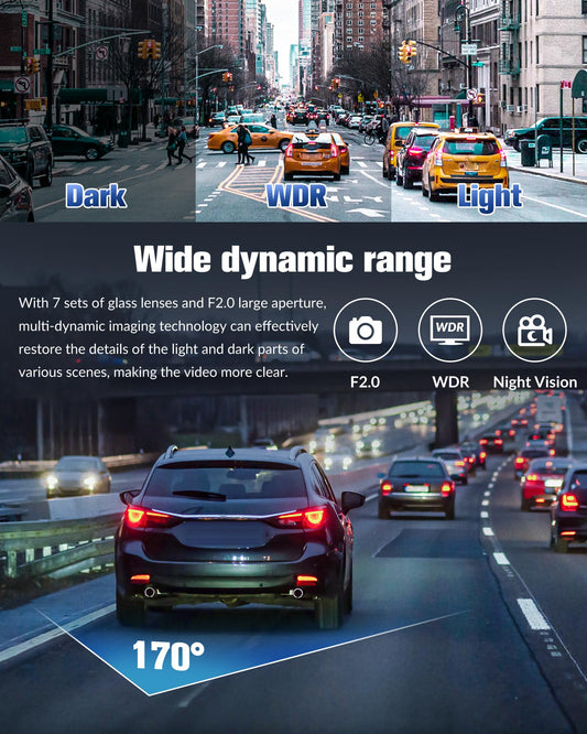 4K Full UHD 3-Channel Dash Camera for Cars, Front Rear Interior Recording, 32GB Card, Super Night Vision, 2.0 in IPS Screen, 170° Wide Angle