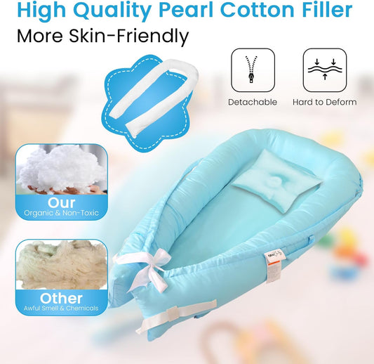 Baby Lounger Nest Pillow for 0-24 Months, Portable Foldable Baby Lounger with Soft Foam Mat, Removable Washable Cover, Blue