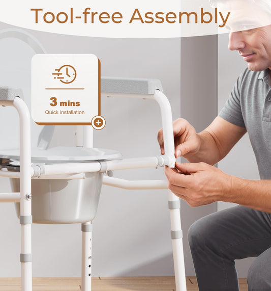 3-in-1 Bedside Commode Chair, Raised Toilet Seat & Safety Frame, Dual-Crossbar Support, 350 lb (159 kg) Capacity, 7.5 qt (7.1 L) Bucket, White