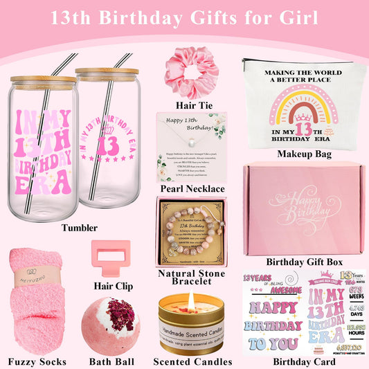 13th Birthday Gift Box for Girls, 11-Piece Sweet 13 Set with 16 oz Tumbler, Candle, Bath Bomb, Socks, Jewelry, Makeup Bag & Card (M, 13th)