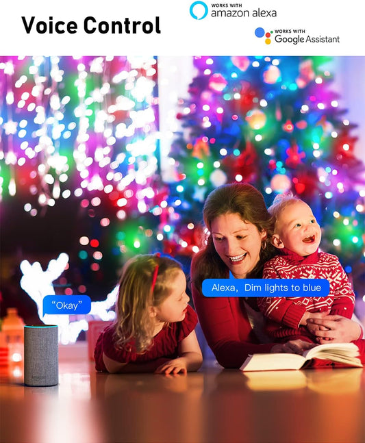 Smart WiFi Christmas Lights - 33Ft, 100LED, RGB, App Control, Voice Compatible, 20 Modes, for Home & Outdoor Decor