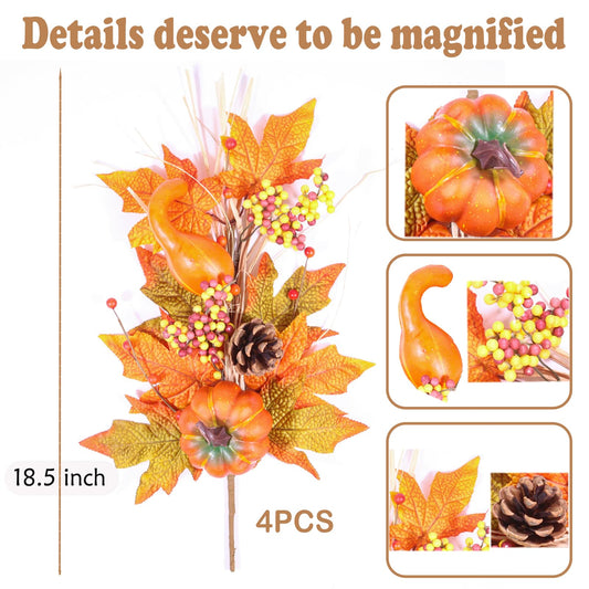 Fall Decor for Home: 4pcs Big Pumpkins Maple Leaves, Faux Floral Stems, Thanksgiving Décor Gifts, Autumn Leaf Picks for Kitchen, Table, Festive Season Enhancements