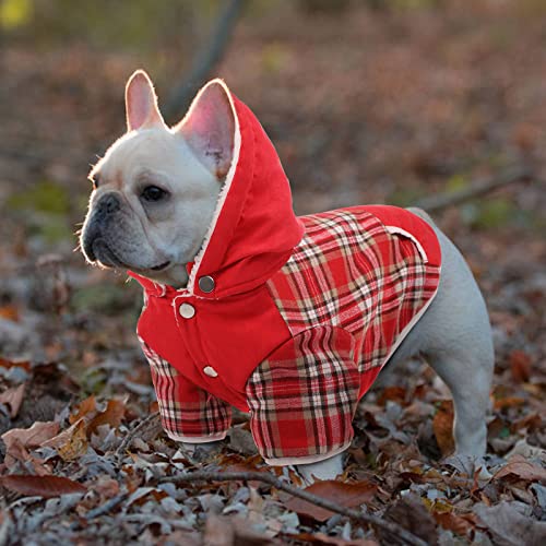 IKIPUKO Dog Winter Coat, Dog Fleece Jacket Dog Coat with Harness Hole Dog Hoodie with Hat Plaid Warm Dog Coat for Large Medium Small Dogs Puppy Hoodie Hooded Cold Weather Clothes(Red,L)