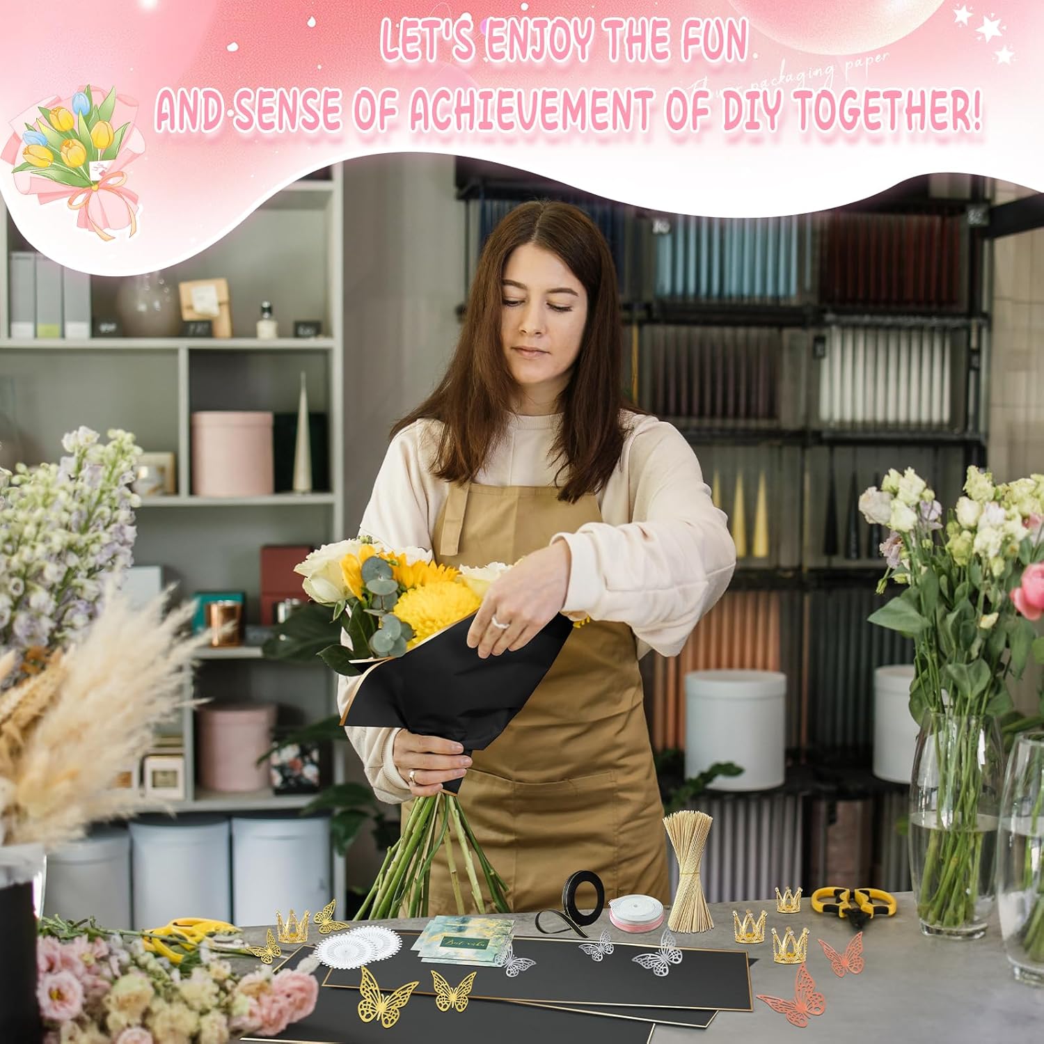 Your kit is enhanced with 48 vibrant 3D butterflies, a 72-foot (22-meter) roll of slender, gold-edged black ribbon, and 160 sparkling diamond pins that add a touch of glamour to any arrangement. Included are also 10 greeting cards for personal messages, making each bouquet a heartfelt gift.