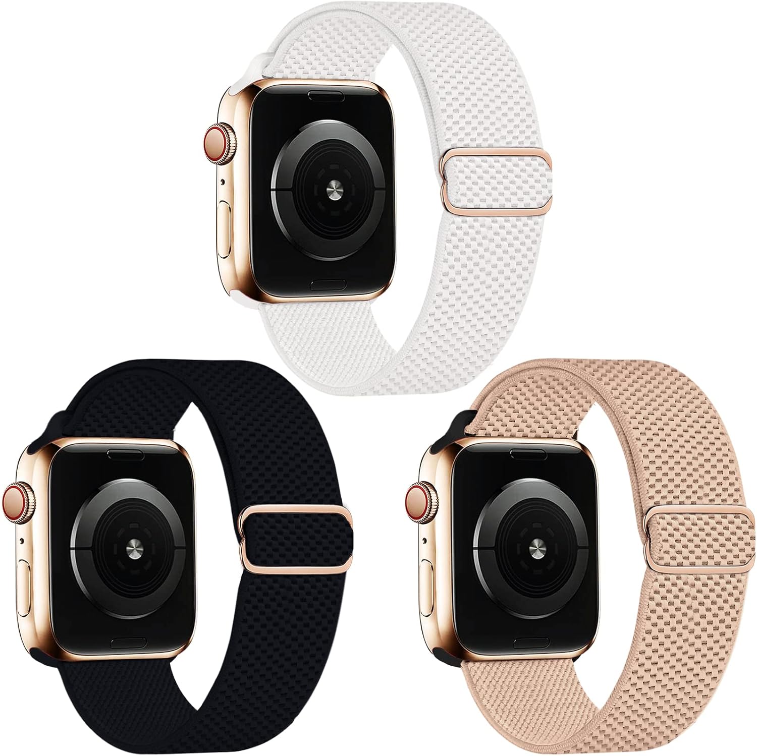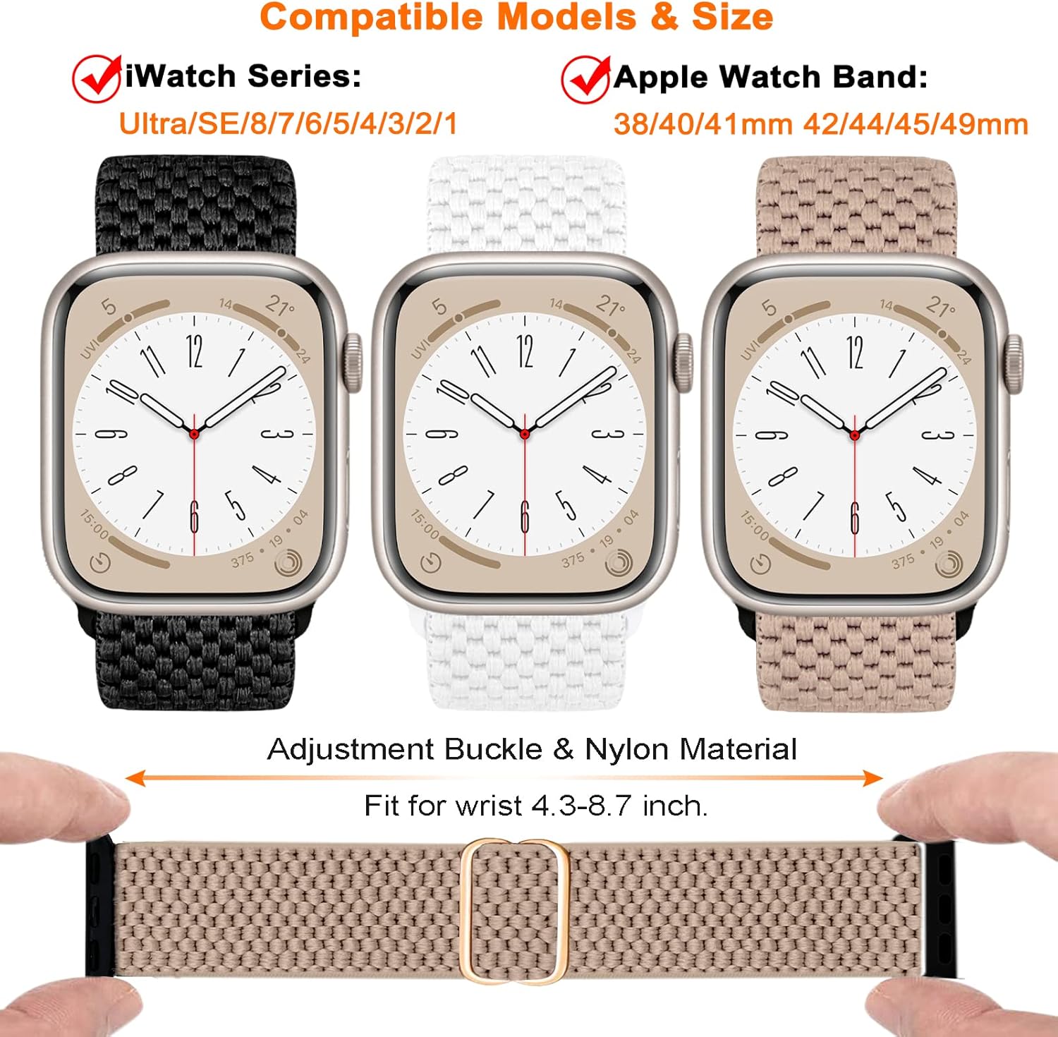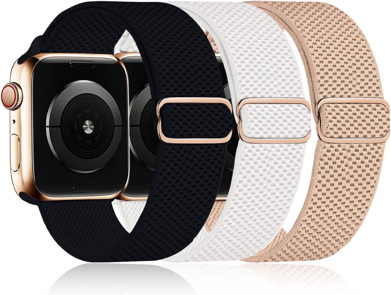3 Pack Stretchy Nylon Solo Loop Band for Apple Watch 42mm, 44mm, 45mm - Adjustable, Breathable, in Black, White & Light Brown