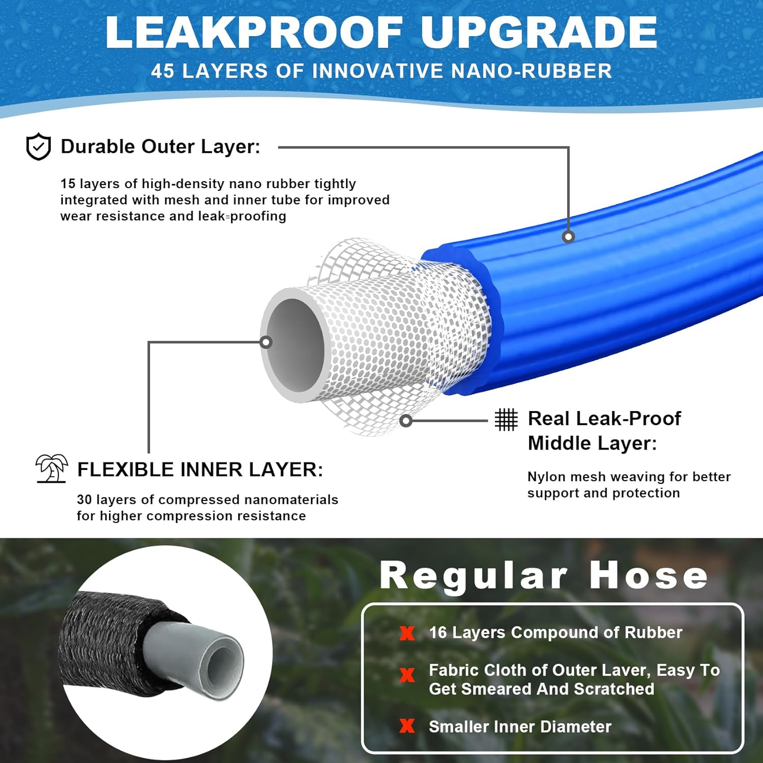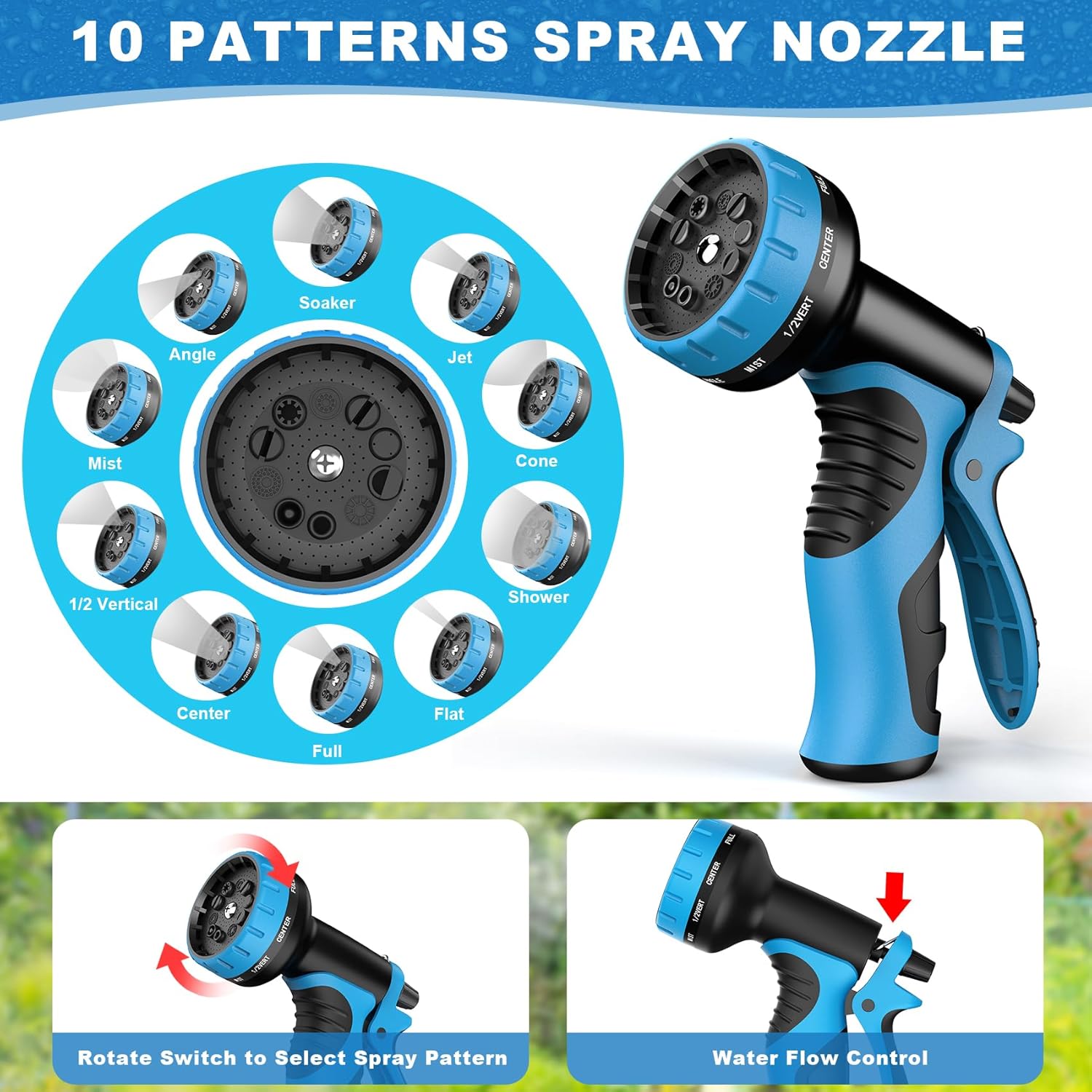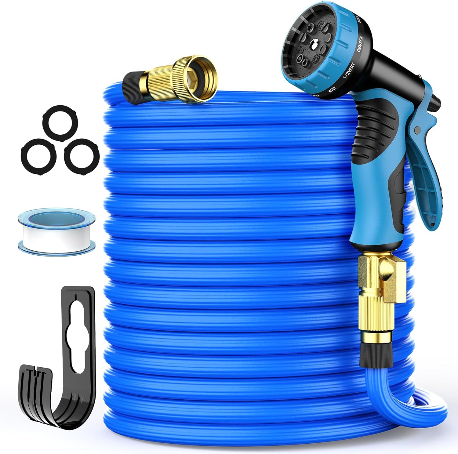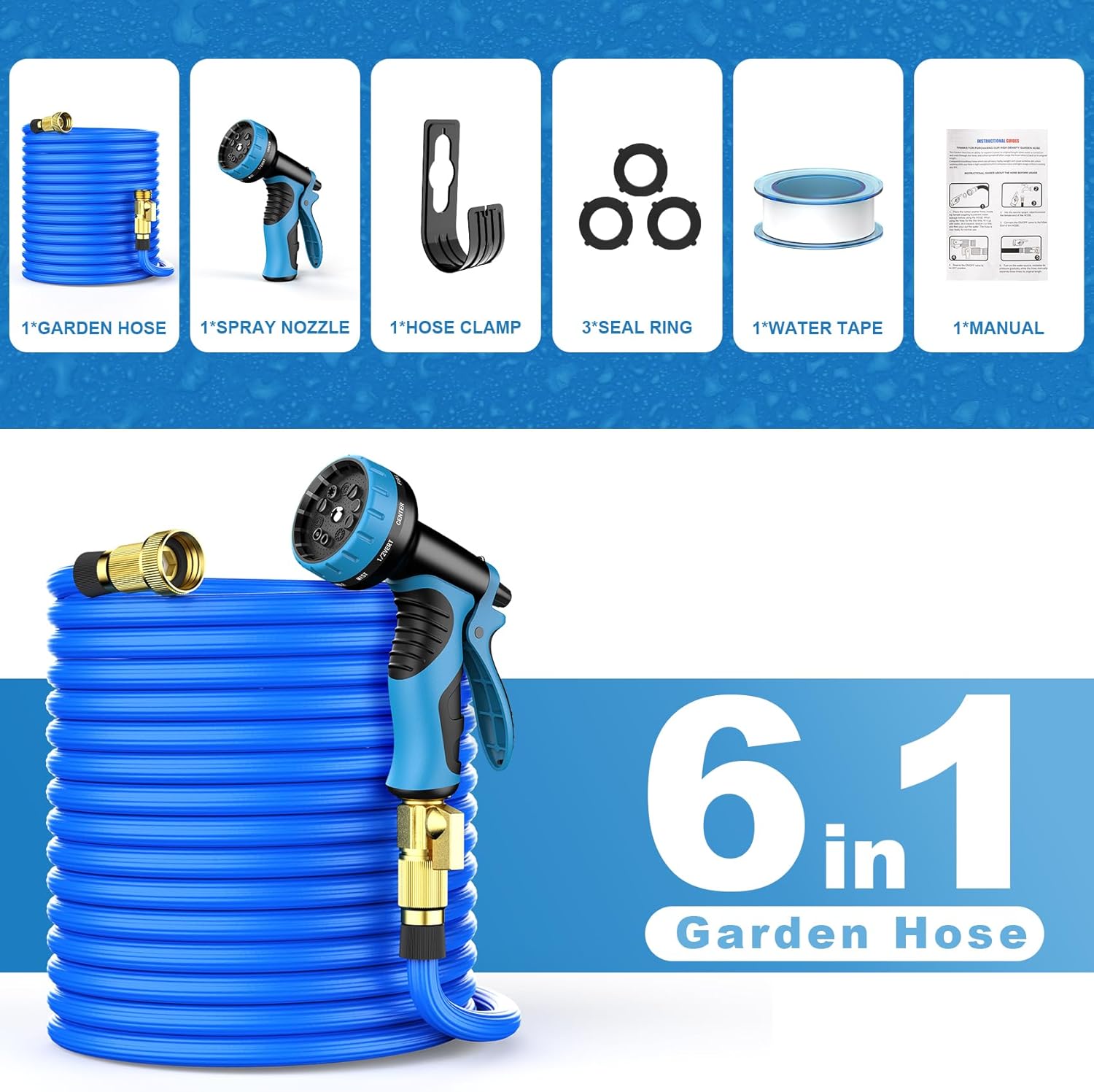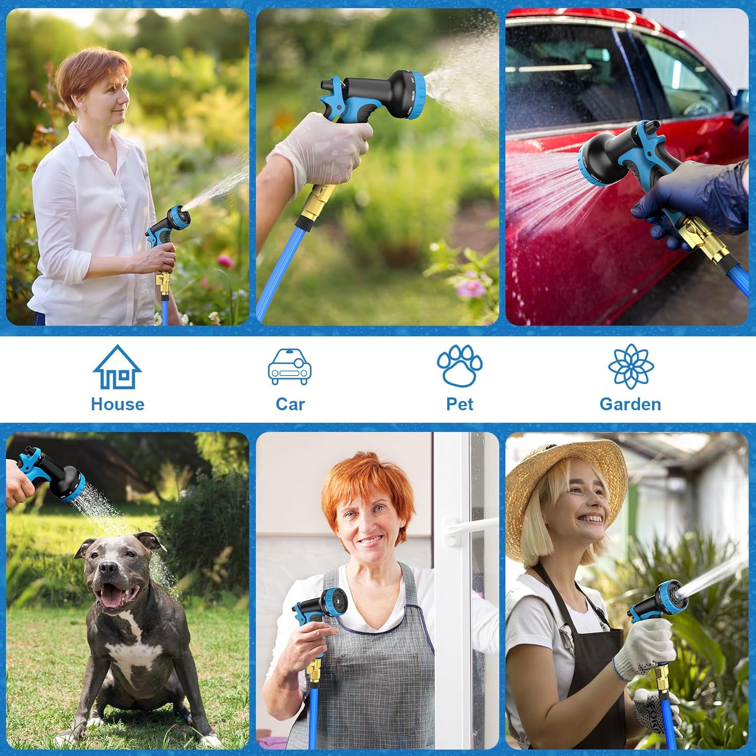 Discover the ultimate solution for your gardening and outdoor needs with our 50ft Expandable Garden Hose, equipped with a 10-function nozzle to cater to various watering requirements. This hose uniquely combines flexibility and durability, expanding up to 2.5 times its length from 20ft to 50ft (from 6m to 15m) under water pressure, and conveniently shrinking down for easy storage. Constructed from high-density natural rubber and a polyester braided fiber yarn, the inner layer is designed for maximum stretch and minimal deformation. The outer layer boasts cutting-edge nano rubber technology, making it dirt-resistant, wear-resistant, and anti-aging, thus maintaining its sleek appearance and ensuring longevity. It comes with a lightweight design, weighing only 3 pounds, enhancing maneuverability and ease of use around gardens, driveways, and patios for watering plants, cleaning exteriors, washing cars, or bathing pets. Included in the package is a handy hose hanger for hassle-free storage. The included 10-pattern hose nozzle offers settings from mist to jet, allowing for precise control over your watering and cleaning tasks. Each hose is fitted with solid 3/4-inch brass connectors, ensuring a secure fit and leak-proof reliability. Embrace a new level of practicality with this essential tool for efficient and effective watering and cleaning.