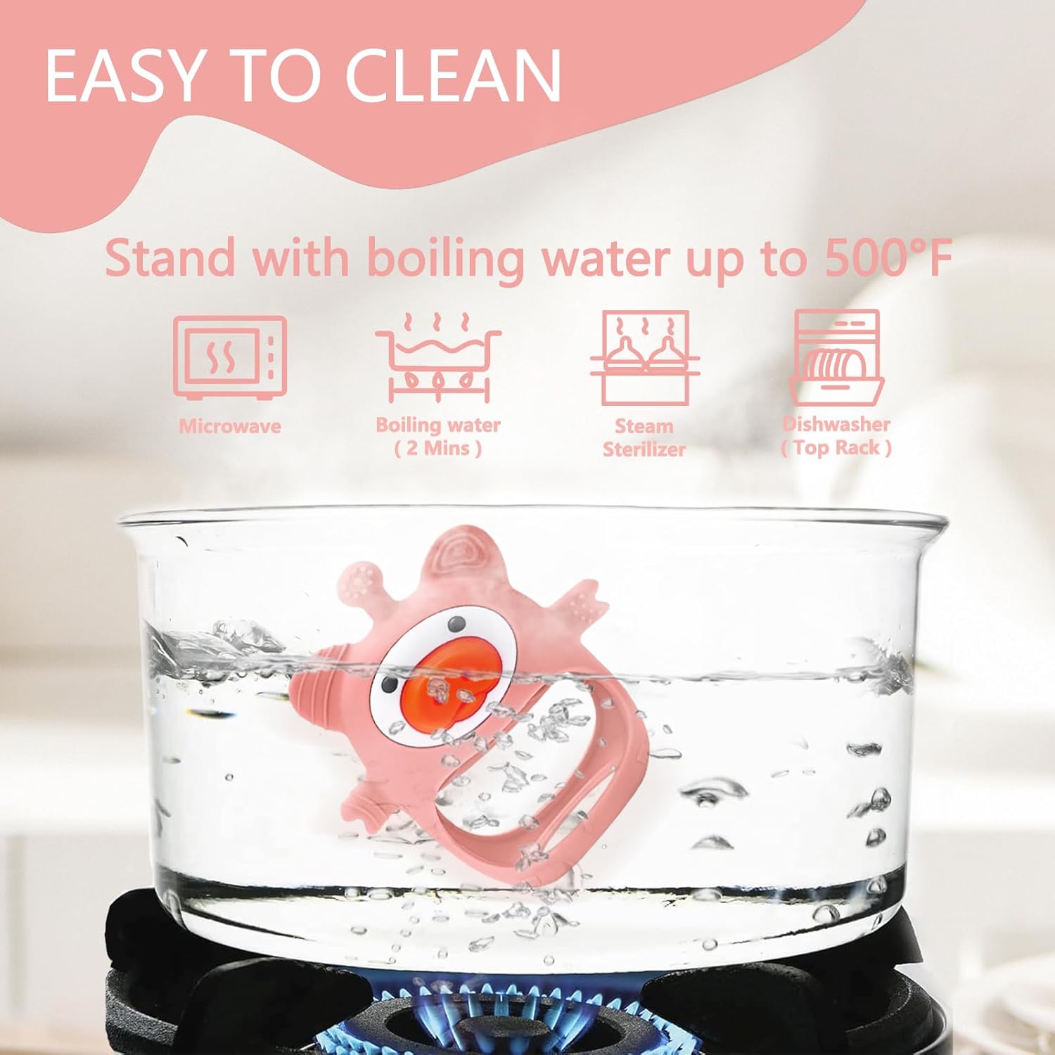 The unique design features bump massage particles on the nipple part to enhance relief and encourage healthy dental development. With a practical wrist strap, the teether stays securely in place, ensuring it never drops and remains clean. It's easy to wash and can be sterilized in boiling water or a steam sterilizer, making maintenance effortless.