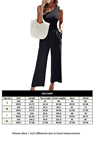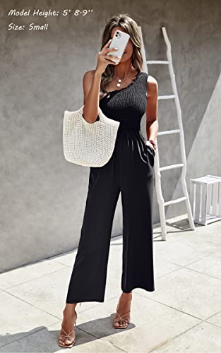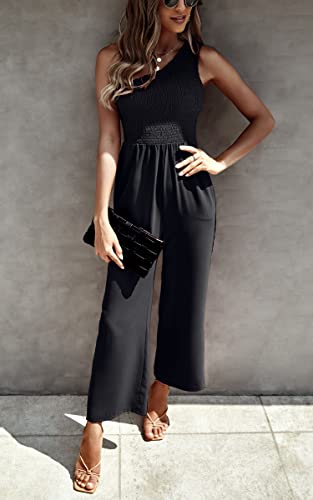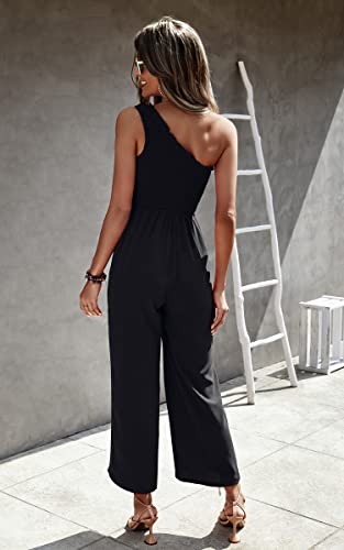 Angashion Women's Summer Wide Leg Jumpsuits One Shoulder Casual Sleeveless Elastic High Waist Solid Color Romper with Pockets Black Small