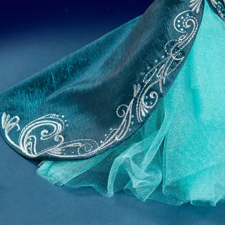 Discover the enchanting elegance of the Ariel Limited Edition Doll from the Disney Designer Collection Midnight Masquerade Series – Fashionably Late. This exquisitely crafted doll captures Ariel in a stunning human form, dressed to impress at the mystical Midnight Masquerade. Ariel's couture gown, a form-fitting masterpiece, features a fishtail hem adorned with metallic embroidery and sparkles with faceted gems, reflecting her oceanic origins. The gown is complemented by a shimmering mesh underskirt that mimics the delicate fins of her mermaid form, and a dramatic organza train embellished with embroidered filigree adds a touch of regal flair.