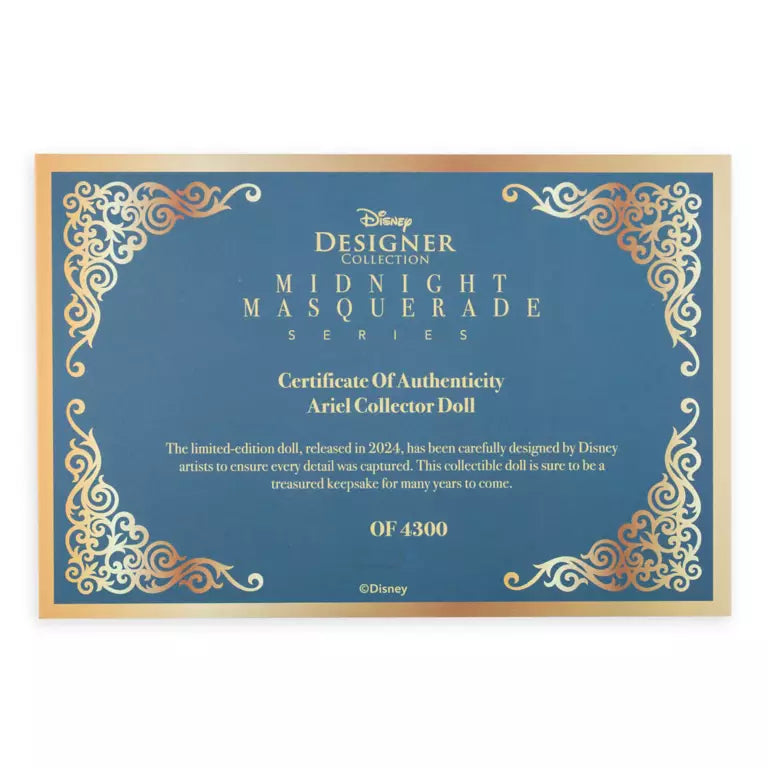 Crafted with the highest attention to detail, this Ariel doll is not only poseable but also stands as a testament to the high quality expected from Disney collectibles. The Disney Designer Collection Midnight Masquerade Series is inspired by the iconic film "The Little Mermaid" and brings together the allure of mystery and the charm of moonlight in a celebration of Disney's beloved characters. Don't miss the chance to own a piece of Disney magic with this mesmerizing Ariel doll, a perfect addition for fans and collectors alike.