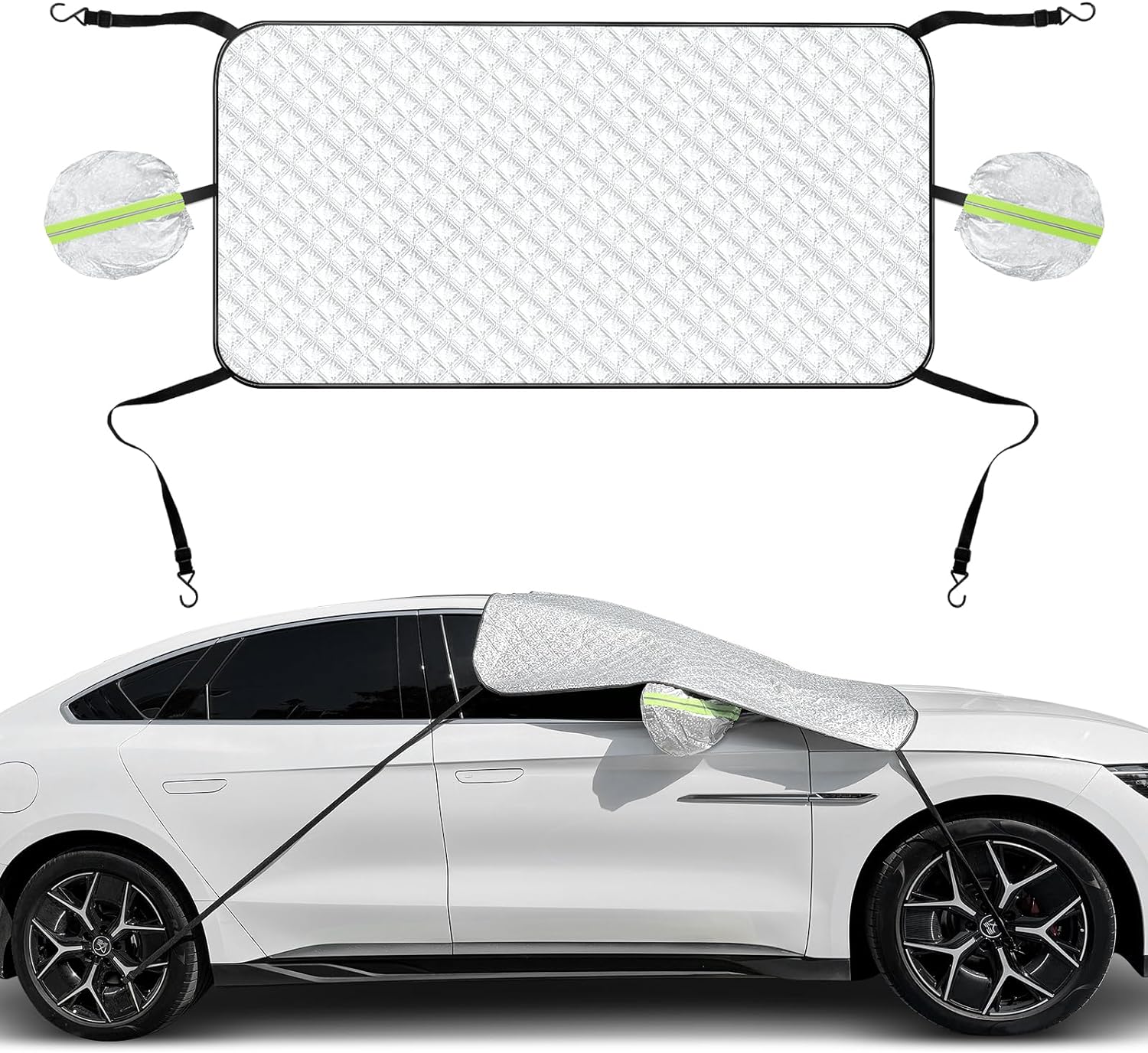 Prepare your vehicle for the harshest of winters with our premium Windshield Snow Cover, designed to offer unparalleled protection against snow, ice, and frost. Measuring an impressive 96x58 inches (243.84x147.32 cm), this cover is large enough to fit most cars, trucks, vans, and SUVs, ensuring a snug fit over your windshield to keep it clear and ready for the road. Crafted from high-quality materials, this cover boasts a robust 4-layer construction, including aluminum foil, spunlaced cotton, warp weft cotton, and a soft white lining. This combination not only ensures durability but also provides exceptional insulation to keep your windshield clear of ice and snow.