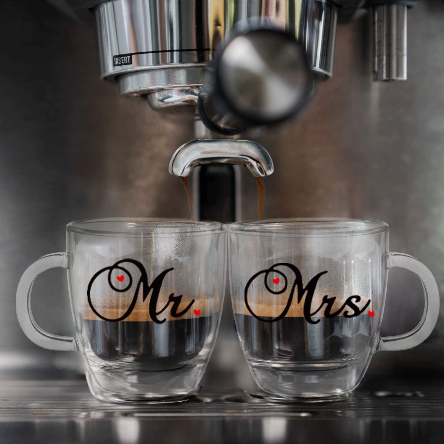 Dive into the unique charm of our "Mr and Mrs" Espresso Glass Set, the quintessential celebration of unity and togetherness. It stands out as a top pick for numerous gift-giving occasions, spanning from wedding gifts for couples to Christmas presents for your beloved duos. Its universally appealing design makes it equally suitable for newlyweds, engaged couples, or long-married spouses, adding a delightful touch to bridal showers, anniversaries, or just-because moments. The set, with its sleek "Mr & Mrs" print complemented by passionate red hearts, is more than just a symbol - it's a sensory experience that enhances your favorite beverages.