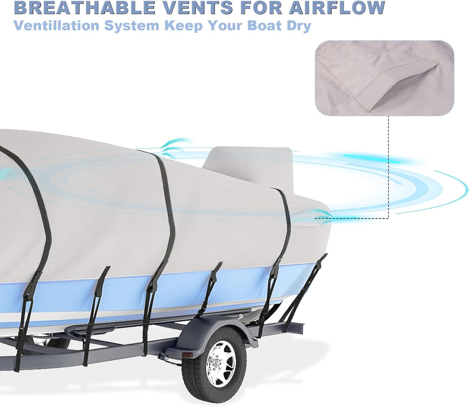 The triple-layered polyester with a PU coating withstands up to 4000 Pa of water pressure, and the seam sealing tape on the backside ensures absolute waterproofing. Strategic air vents reduce wind stress and allow moisture to escape, keeping your boat dry and well-ventilated. This trailerable cover includes windproof buckle straps that extend easily to your trailer, along with a robust elastic cord for a snug fit around the base.
