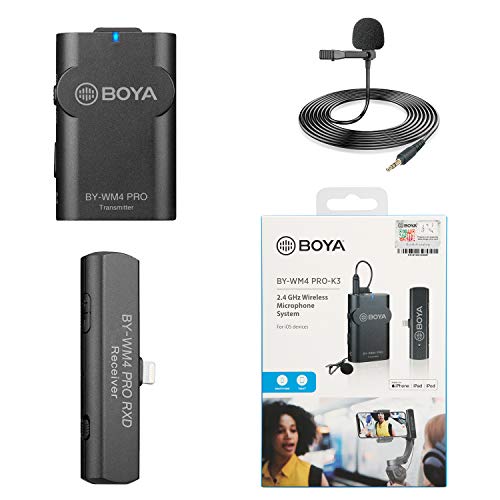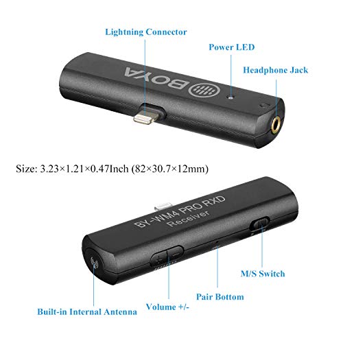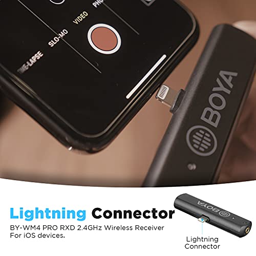 - Designed for Lightning iOS Devices --- It consists of one body-pack transmitter (TX4 Pro), wireless receiver with a Lightning connector (BY-WM4 PRO RXD)
