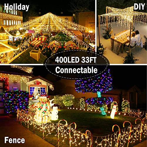 Christmas Lights Outdoor Decorations 400 LED 33ft 8 Modes Curtain Fairy String Light with 75 Drops, Clear Wire LED String Light Indoor Decor for Wedding Party Holiday Christmas Decorations Warm White