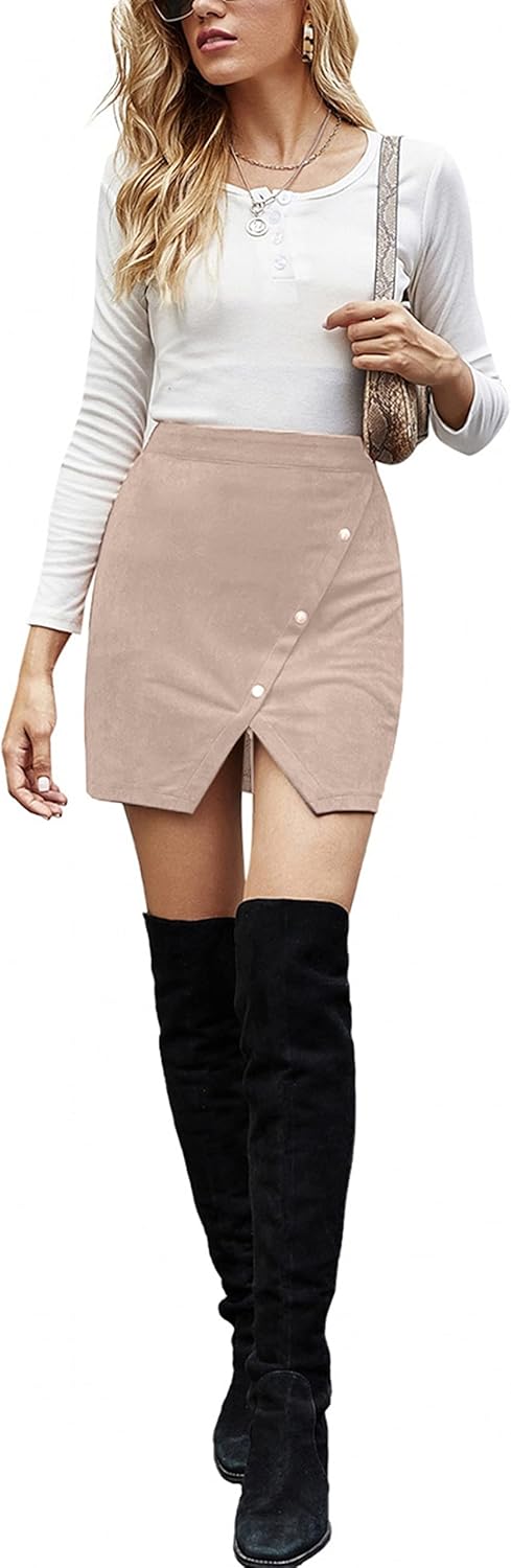 This Medium Women's Faux Suede High Waist Button A-Line Mini Pencil Skirt in Beige is designed for those who appreciate retro-inspired fashion with a modern twist. The soft faux suede material provides a luxurious, comfortable feel while maintaining a lightweight texture that is perfect for layering. A row of antique gold snap buttons runs down the front of the skirt, adding a touch of elegance to its simple yet stylish design. The high waist accentuates the figure, and the slight stretch in the waistband ensures a comfortable fit. With practical side pockets and a zipper closure at the back, it’s both functional and fashionable. This skirt is ideal for creating versatile looks, from pairing it with a dramatic blouse and heels for a night out to layering it with leggings for cooler weather. Whether you're attending a spring event or simply enjoying a stylish day out, this skirt is an essential addition to your wardrobe.