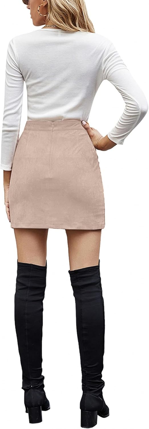 Medium Women's Faux Suede High Waist Button A-Line Mini Pencil Skirt in Beige