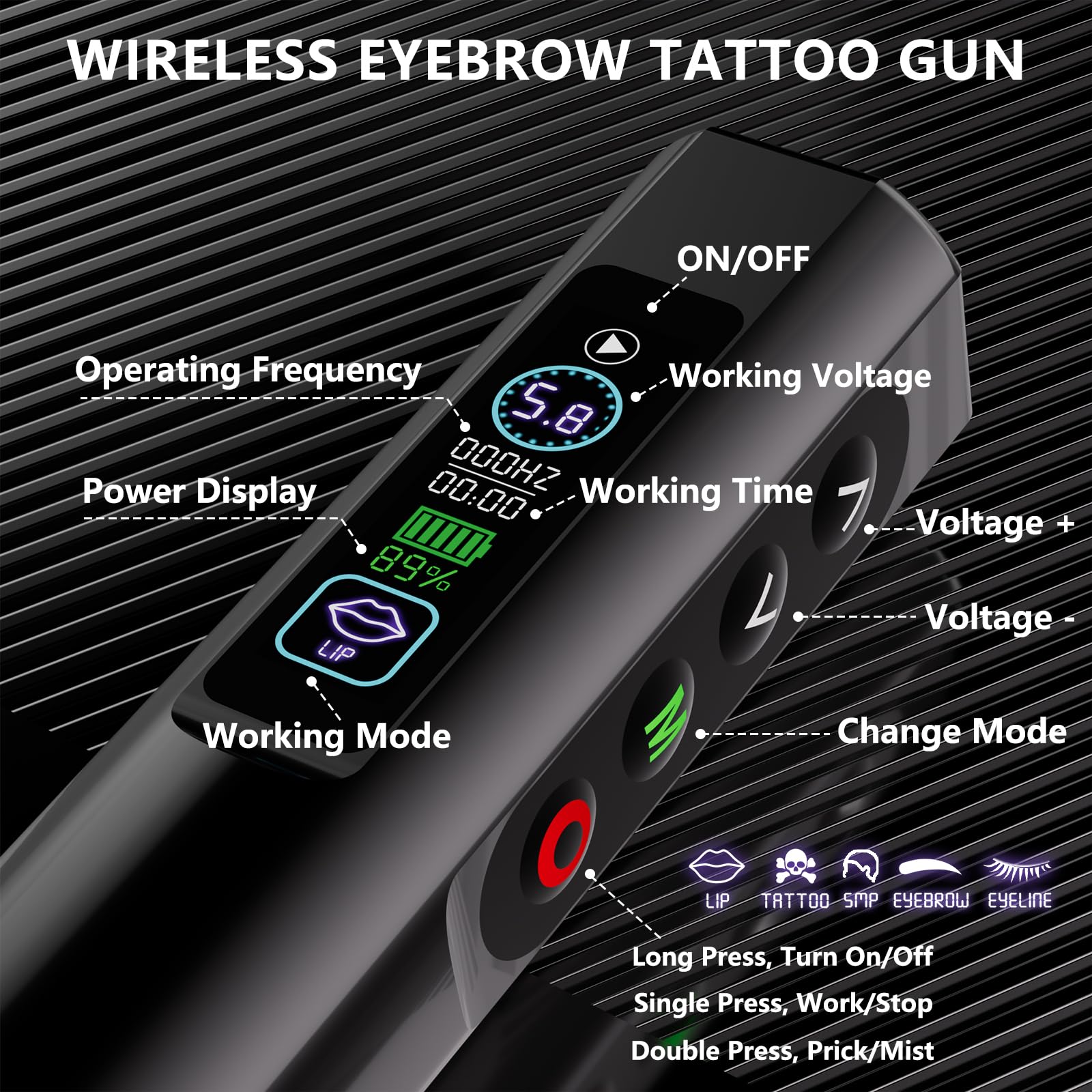 This wireless microblading kit is built for eyebrow tattoo practice and detailed cosmetic-style work, combining a rotary tattoo pen with a digital LED display and a full set of beginner-friendly supplies. The pen is designed for stable, low-noise operation in a lightweight body, with adjustable output from 2V–9.9V and a speed range of 6,000–12,000 RPM to support controlled, consistent results.