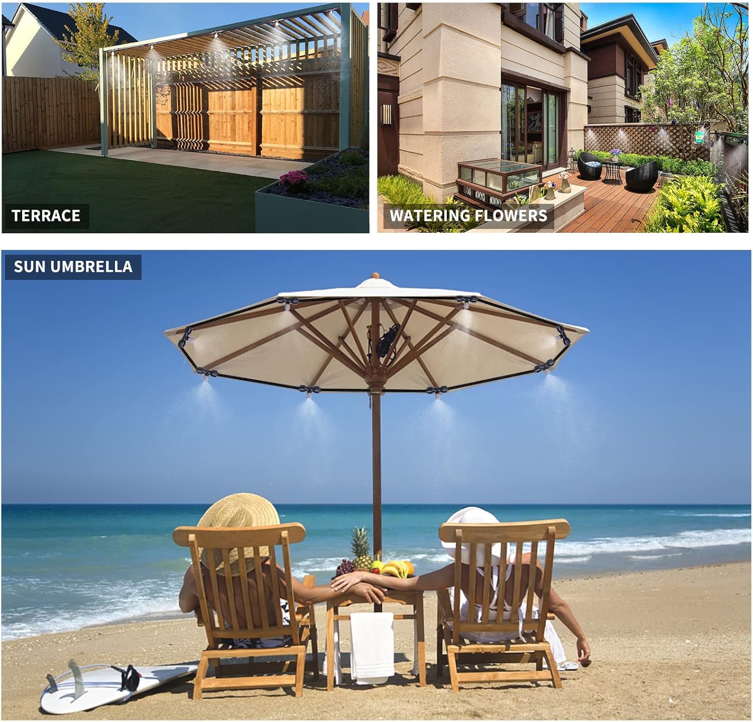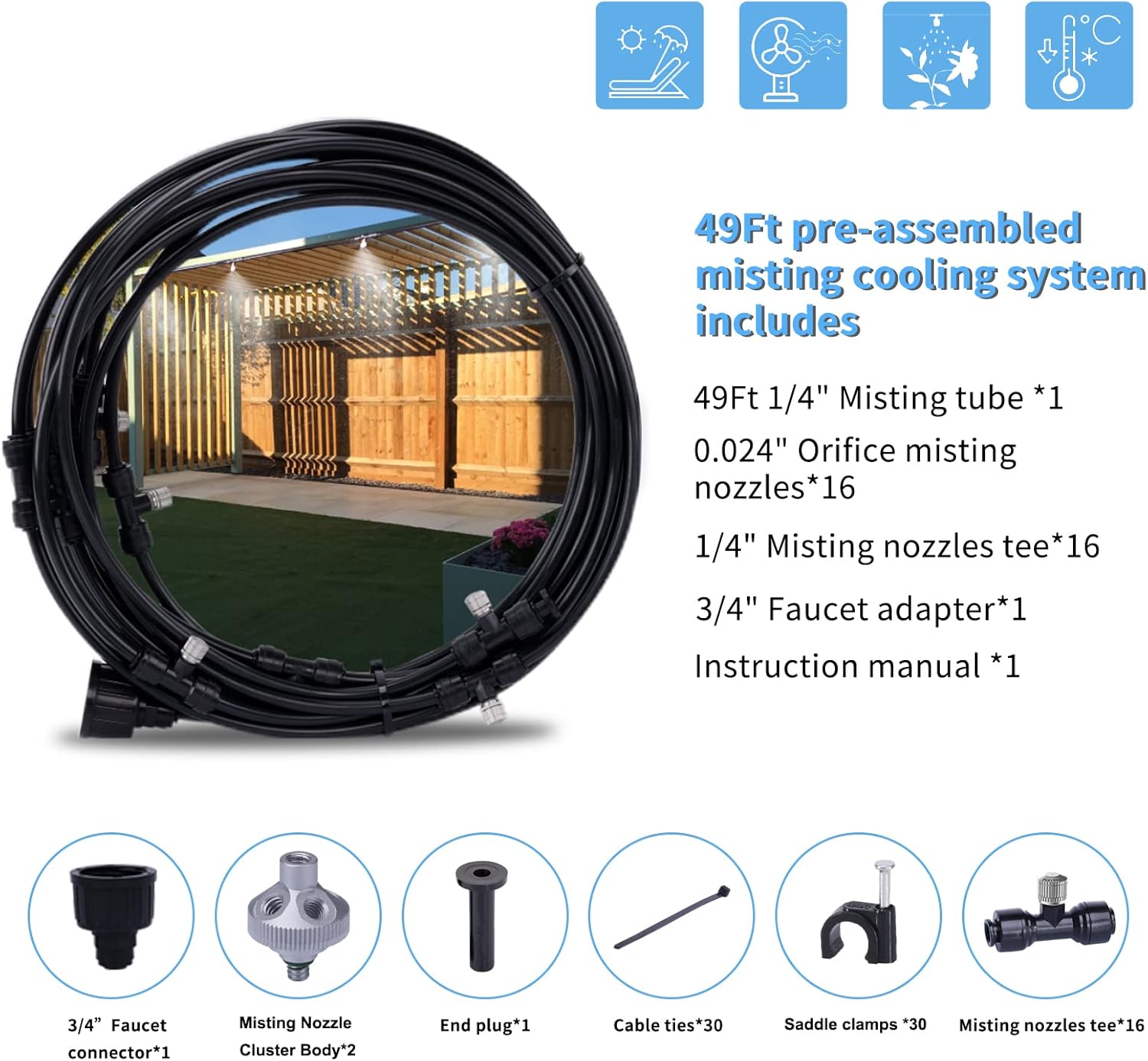 Enhance your outdoor comfort with our Outdoor Misting System designed for efficient cooling and ease of installation. This 49-foot misting system is equipped with 16 high-quality 0.024-inch orifice thread stainless steel misting nozzles, ensuring a fine mist that effectively absorbs heat and cools down your surroundings. The system is incredibly easy to set up—simply attach the misting nozzles to the tee fittings, connect to any standard 3/4-inch faucet, and enjoy instant cooling. The ambient temperature can be reduced by up to 50°F, providing a refreshing escape from the heat without excessive humidity.