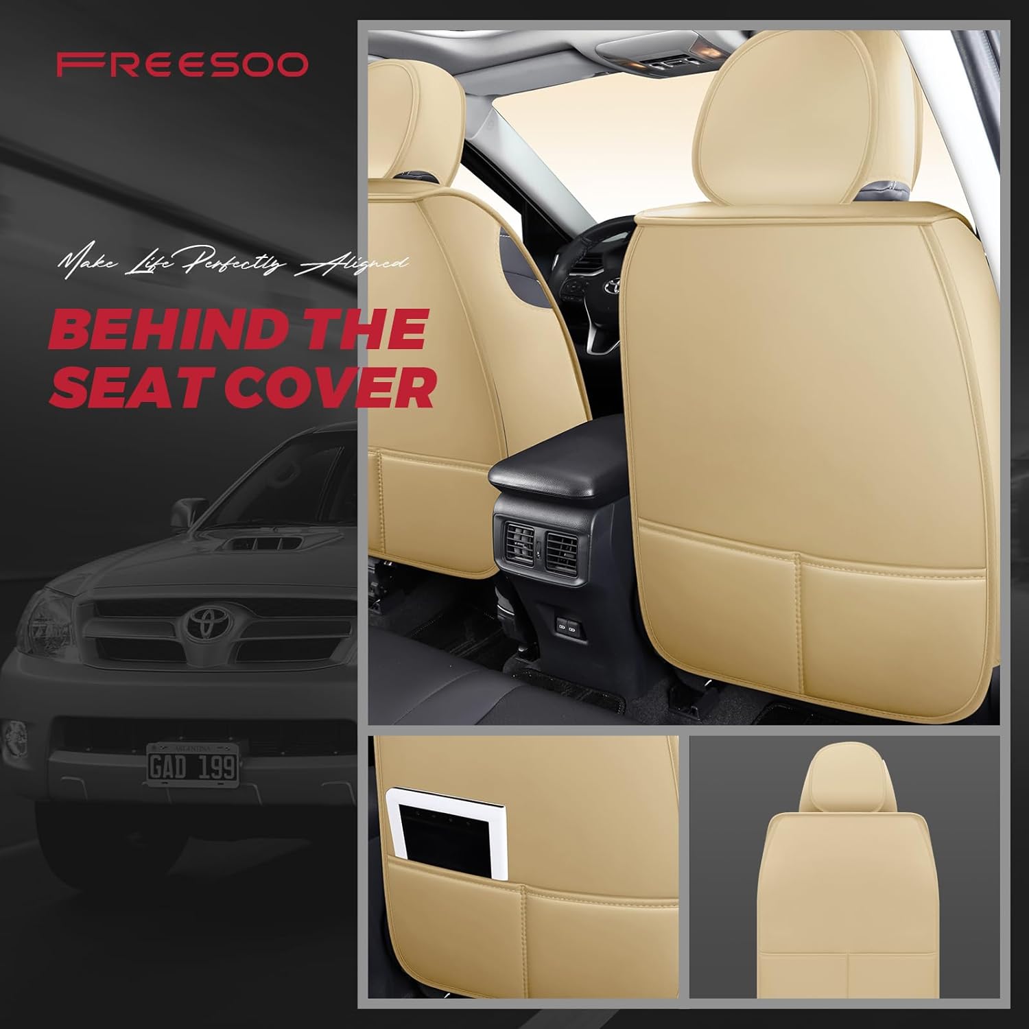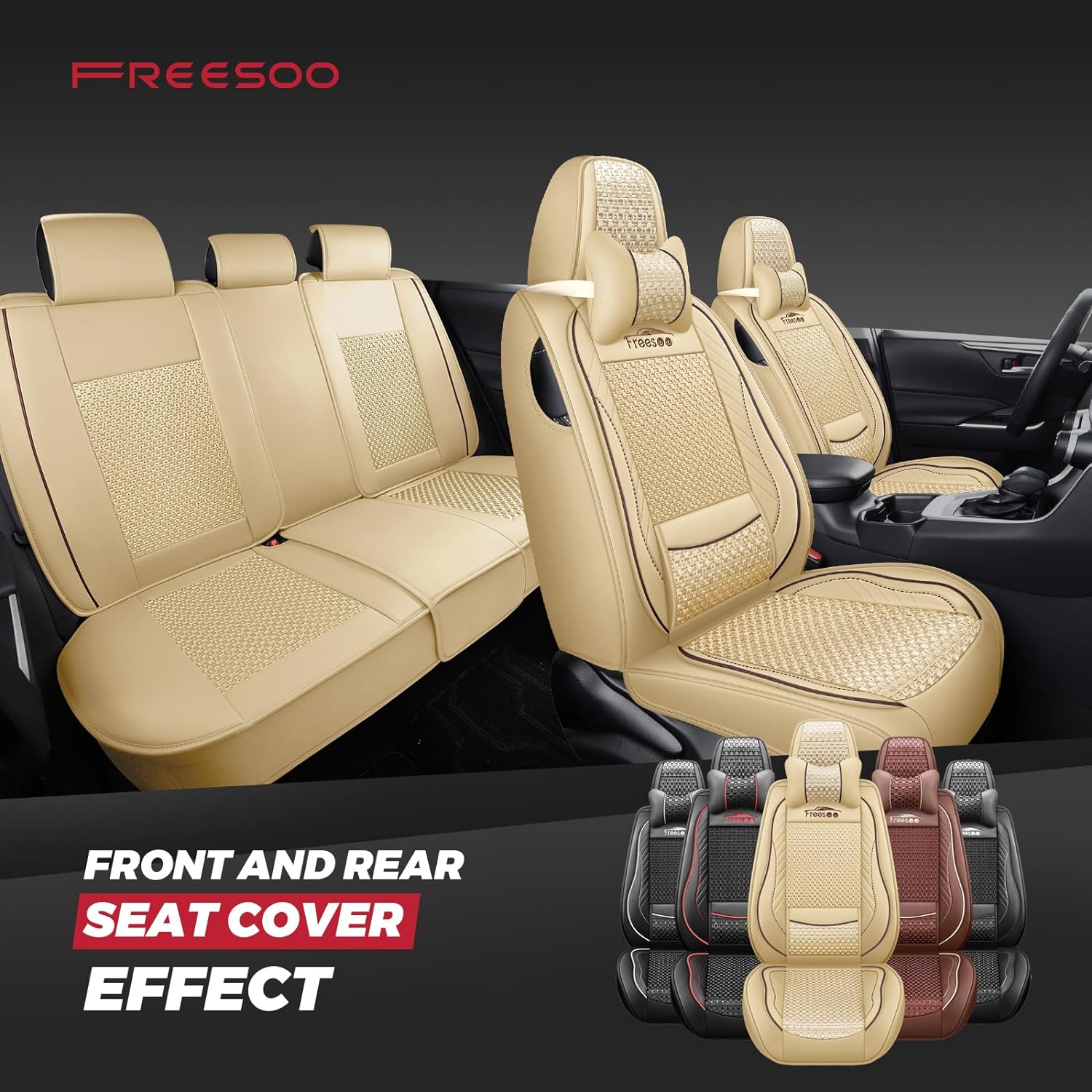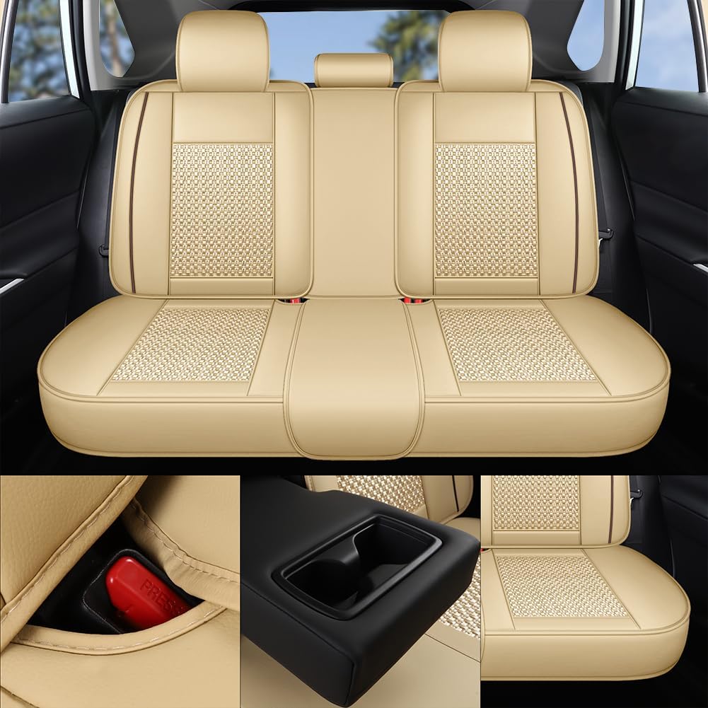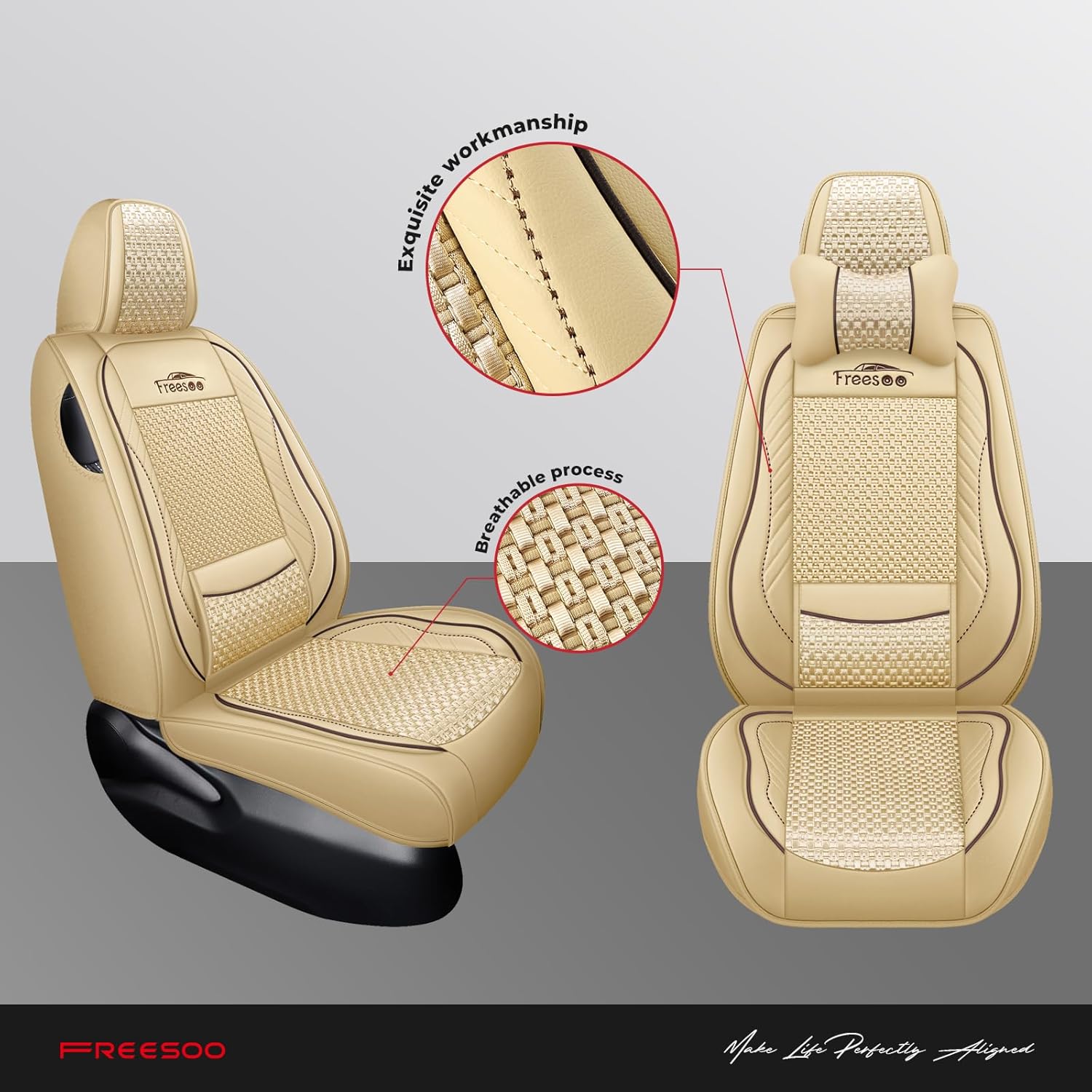 Full Set Beige Leather Car Seat Covers, Breathable and Universal Fit for Sedan, SUV, Coupe - With Lumbar Support