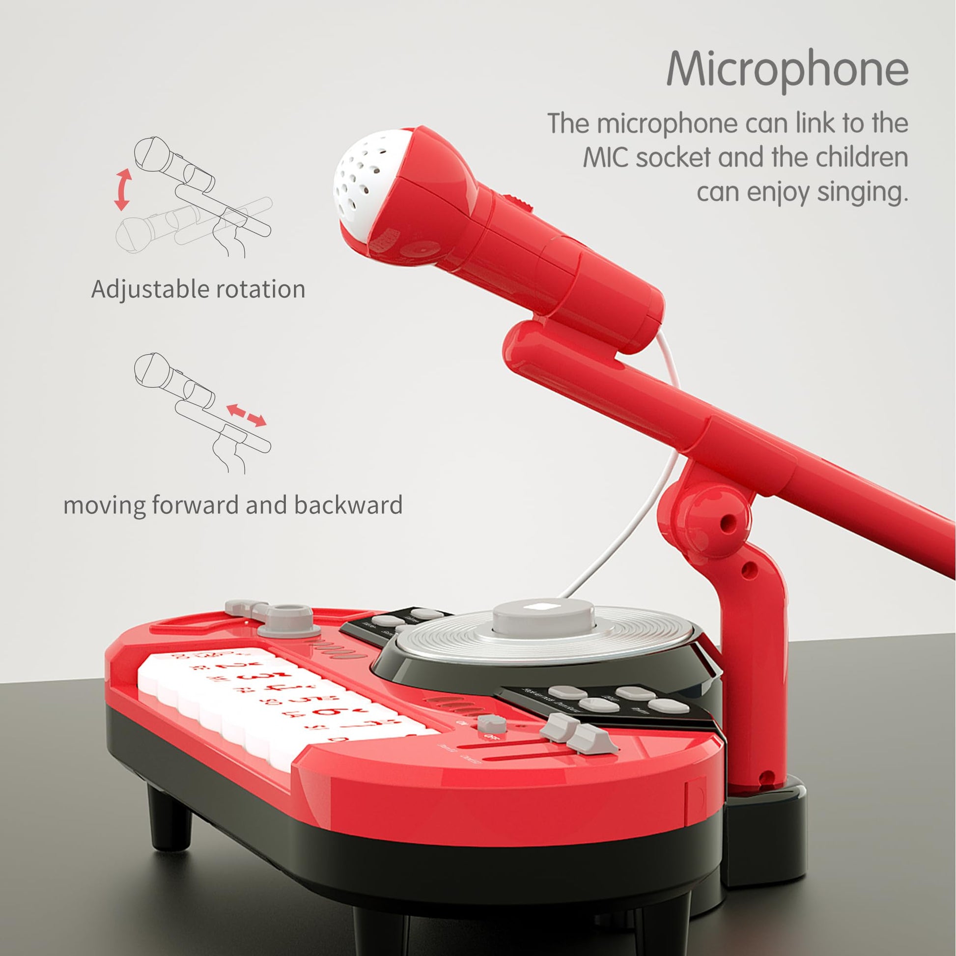 Spark early music learning with this toddler DJ mixer piano toy designed for ages 1–3. The compact keyboard features 8 piano keys, 8 drum sounds, 8 rhythms, 2 timbres, 8 demo songs, and 10 rhythmic lights to keep little musicians engaged. Kids can spin the DJ disc, sing along using the included microphone, and even plug in MP3 or mobile devices for more ways to play. Volume adjusts low/high for comfortable listening. Made from environmental-friendly ABS material with international certifications, it’s built for everyday play and easy cleaning. Great for hand-eye coordination, exploring rhythms and melodies, and creative pretend DJ play. Ideal for birthdays and holidays. Requires 3 AA batteries (not included). Portable for on-the-go fun at home, playdates, or preschool
