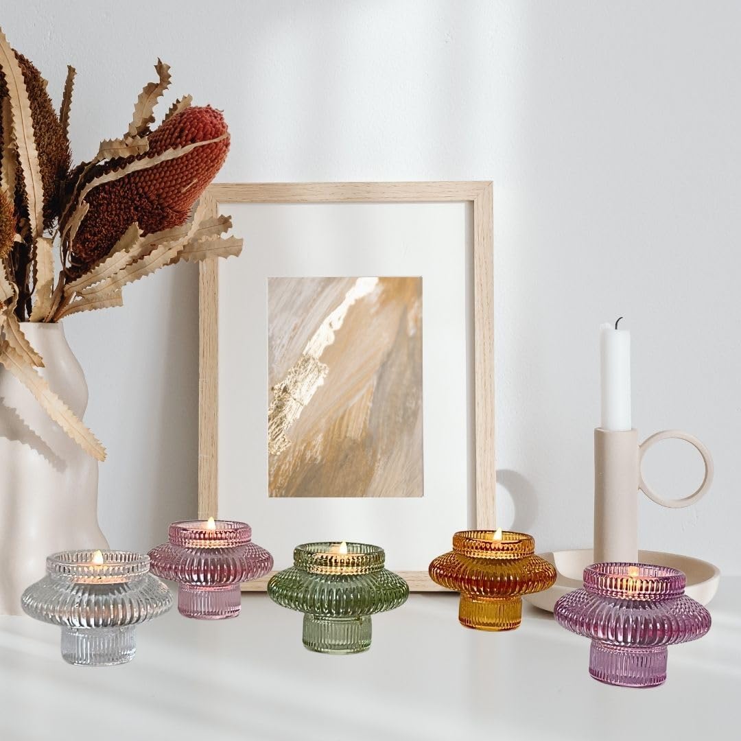Constructed from quality ribbed glass, these candlestick holders are more substantial than most, providing both a luxurious feel and a stable base to prevent tipping. The design allows for short tealight candles to sit securely inside, reducing the risk of mishaps, while also accommodating the option to stack two tealights for added height and luminance.