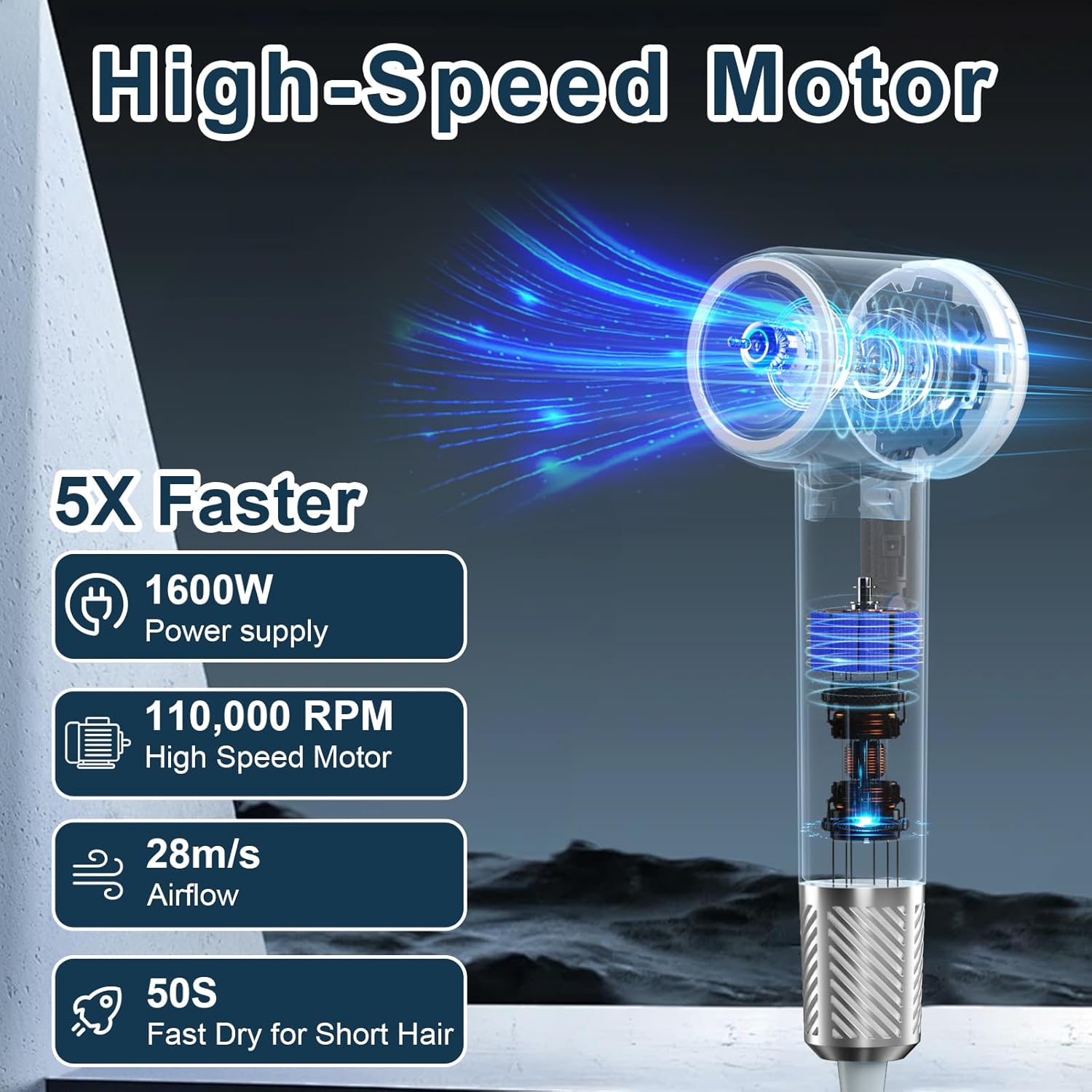 Experience a new level of hair care with our 150000 RPM Professional High-Speed Hair Dryer, designed to deliver quick and efficient drying without the wait. Equipped with a potent 1600W high-speed brushless motor, this hair dryer achieves an incredible 28m/s wind speed, allowing you to dry hair up to 5 times faster than traditional models. It's ideal for achieving perfect dryness in just 1-2 minutes, making it a superb choice for both salon professionals and home users.