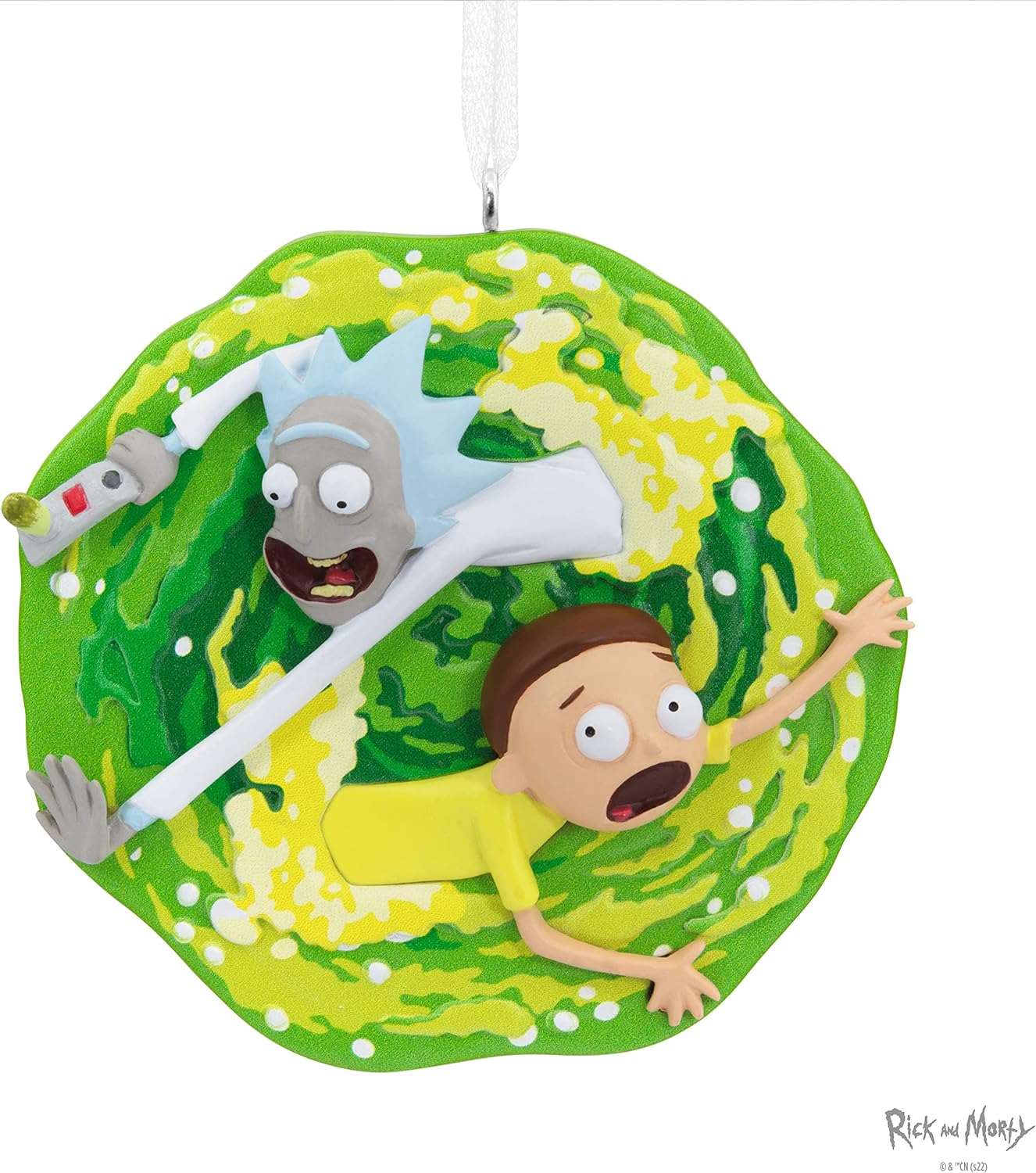 Discover the charm of the cosmos with the Hallmark Rick and Morty, "Aw, Geez, Rick!" Christmas Ornament. This captivating decoration brings the iconic duo, genius scientist Rick and his ever-reluctant grandson Morty, right to your Christmas tree. Captured in the midst of a portal-jumping escapade, this ornament invites you to join in on their interdimensional adventures during the festive season.