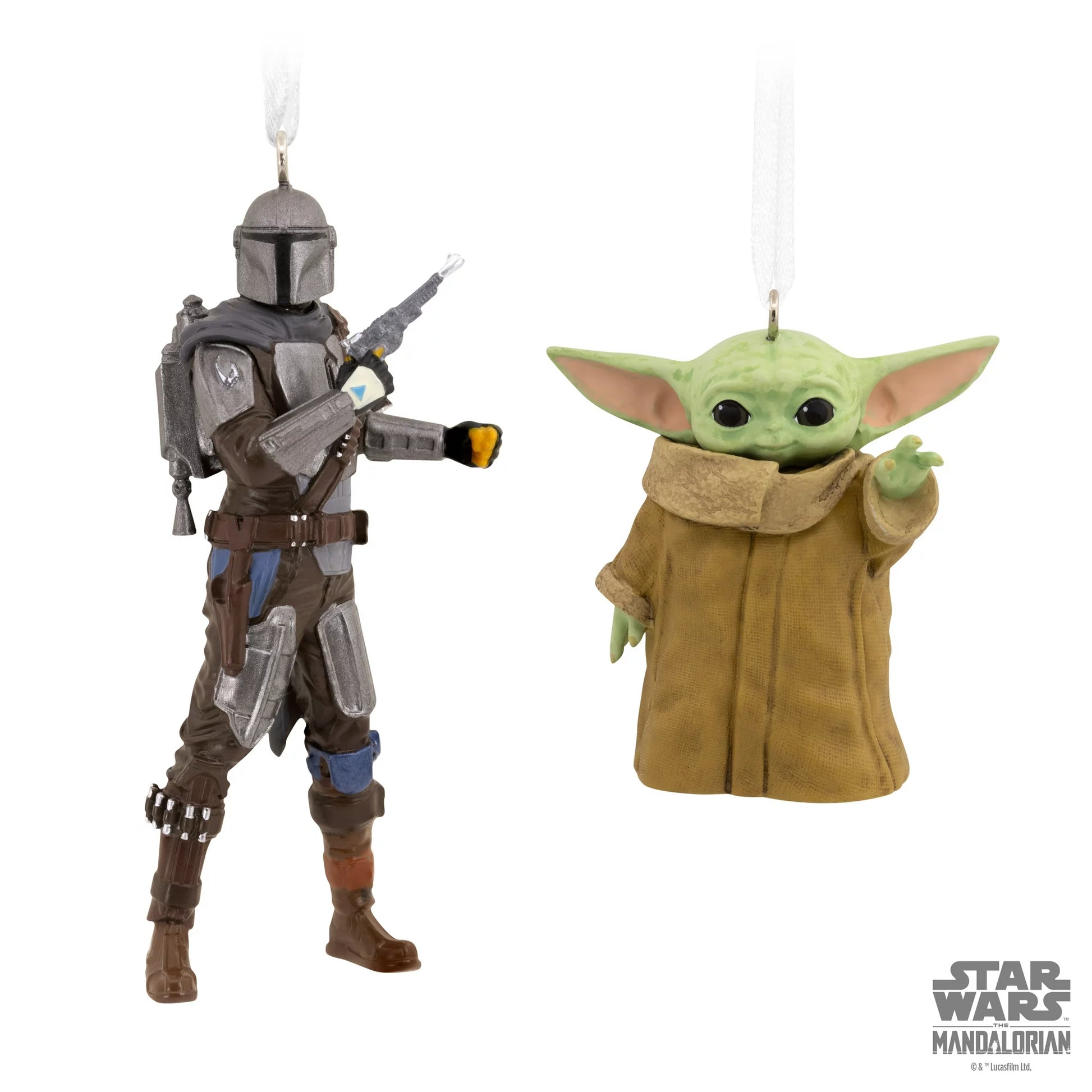 Celebrate the spirit of the holidays and the adventurous world of "Star Wars: The Mandalorian" with this captivating bundle of Hallmark Christmas ornaments. This exclusive set brings together two iconic characters from the beloved Disney+ series: Din Djarin, the valiant Mandalorian clad in his signature beskar armor and equipped with a jetpack, and Grogu, the endearing child known across the galaxy as "Baby Yoda," showcasing his emerging Force powers. Crafted with intricate detail and vibrant colors, these resin ornaments embody the essence of each character, bringing a piece of the Star Wars universe into your home.