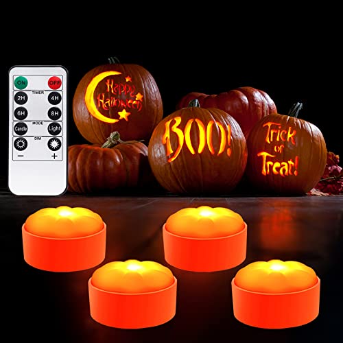 Halloween LED Pumpkin Lights with Remote Timer - Battery Operated Jack-O-Lantern Decor Electric Flameless Candle with Flickering Bright Light for Party Home Porch Fall Decorations - 4 Pack Set