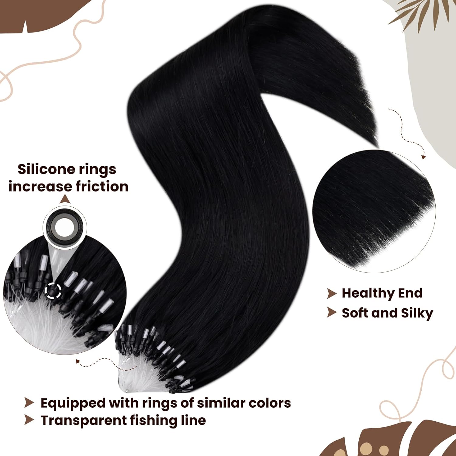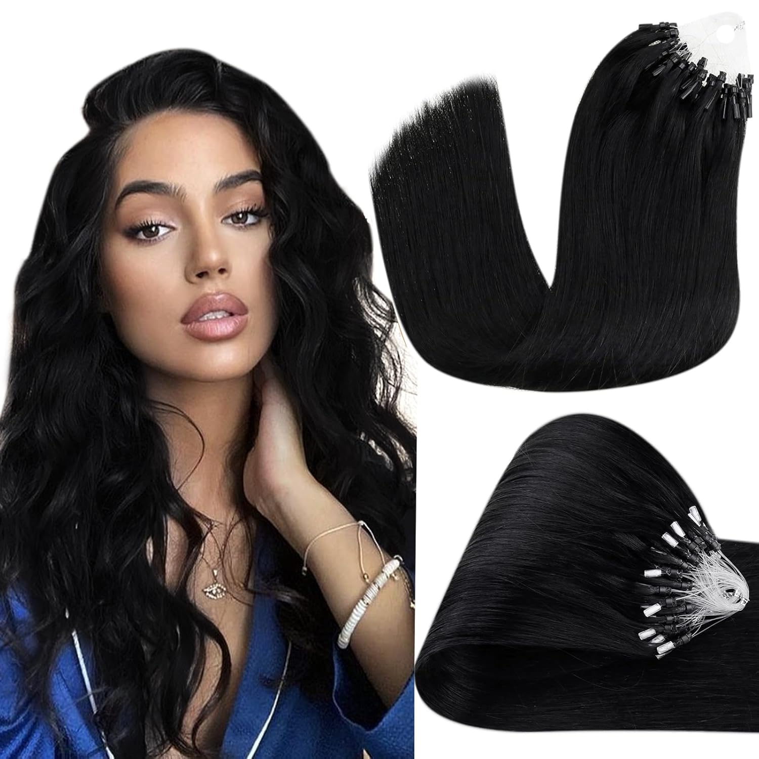 Transform your hairstyle effortlessly with our Micro Link Hair Extensions, crafted from 50 strands of 40g 100% Remy human hair in a striking black shade. These 12-inch extensions are ideal for adding substantial thickness and length while maintaining the integrity of your natural hair, as they do not require heat, glue, or sewing for installation. The extensions integrate seamlessly thanks to microbeads that are colored to match the black hair, rendering them invisible once applied.