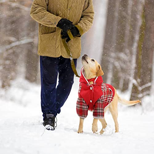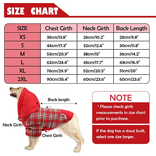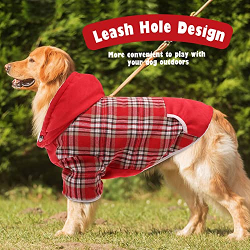 IKIPUKO Dog Winter Coat, Dog Fleece Jacket Dog Coat with Harness Hole Dog Hoodie with Hat Plaid Warm Dog Coat for Large Medium Small Dogs Puppy Hoodie Hooded Cold Weather Clothes(Red,L)