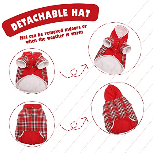 - 🔥DETACHABLE HAT & SNACK BAG🔥: The hood design of plaid dog coat can protect the dog’s head from the cold. The cap can be removed indoors or when the weather is warm. Snack bag on the back of the dog winter jacket is very convenient. You can put some small things or furry friend’s love foods and toys in the plaid dog hoodie's bag when playing outdoors.