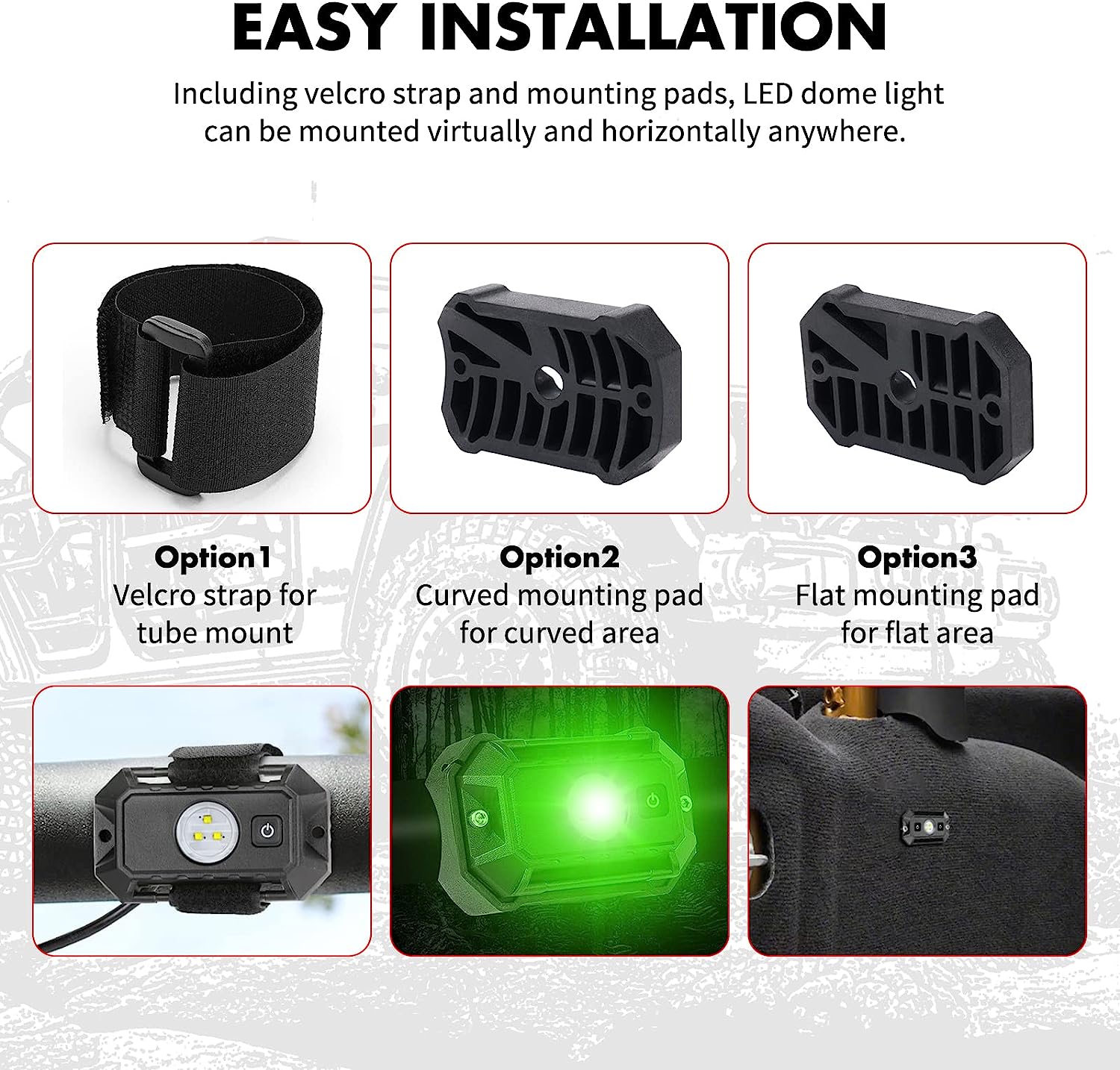This universal dome light offers the ultimate in flexible mounting options, making the installation process a breeze. Whether you wish to place it on the roll bar, roll cage, or any other rounded surface, the included velcro strap and curved mounting pad have you covered. Additionally, the flat mounting pad makes it possible to mount the light in flat areas like the truck bed, top ceiling, engine bay, wheel wells, or any place that necessitates enhanced lighting.