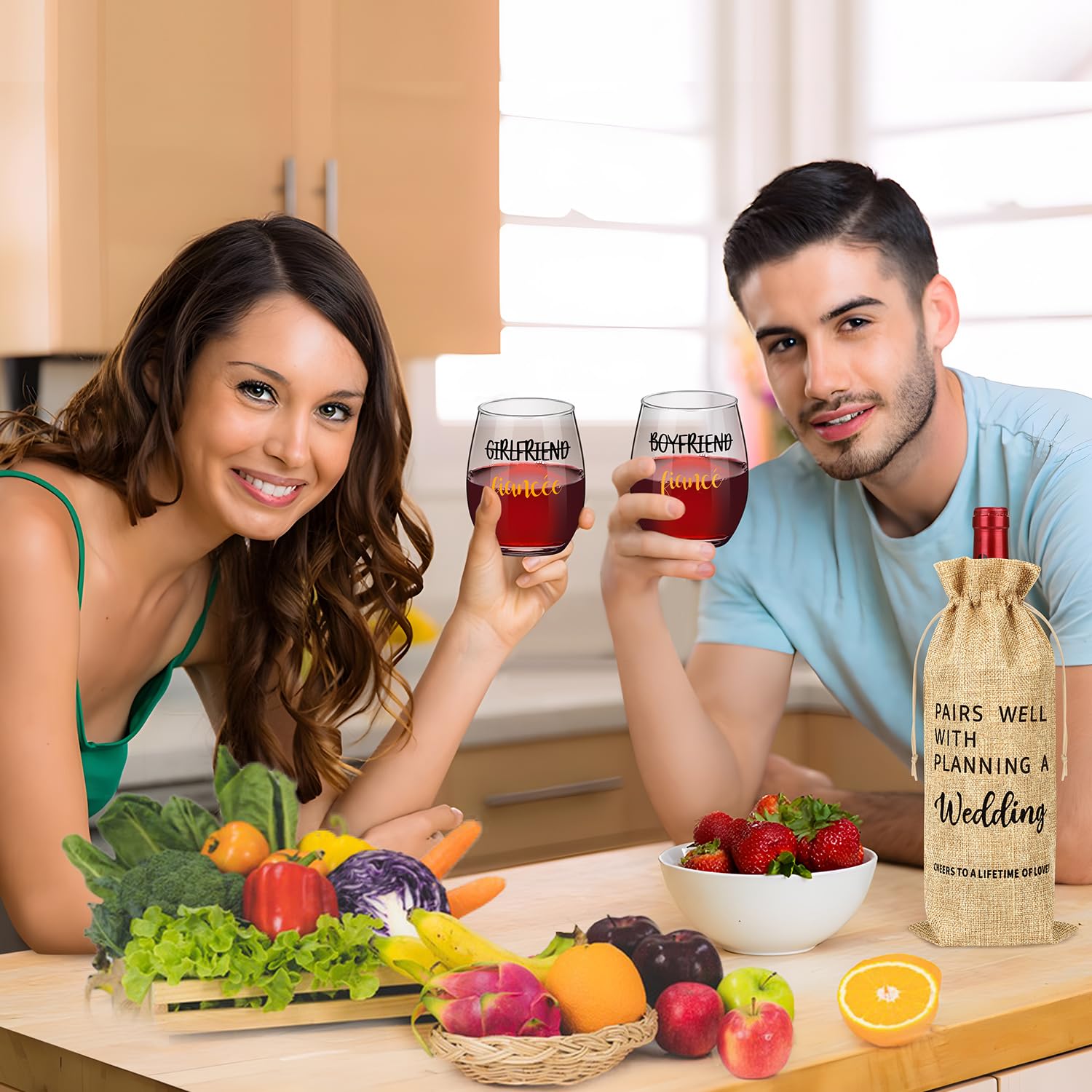 Celebrate love and new beginnings with our specially curated Engagement & Wedding Gift Set. This set boasts two sophisticated wine glasses and a gracefully designed wine bag, tailored to commemorate the journey of engaged and newlywed couples. Be it for the bride and groom-to-be, fiance and fiancee, Mr. and Mrs., or the ever-in-love boyfriend or girlfriend, this gift set is versatile and resonates with every romantic milestone. Infuse every celebration, from engagement parties to intimate evenings, with a hint of luxury and elegance. Our wine glasses, made from high-quality glass, are a testament to durability, designed to last through years of toasts and celebrations. Complementing the glasses is a wine bag crafted from natural linen fabric, melding beauty with durability. Packaged immaculately in a delightful gift box, this set not only symbolizes love but also the essence of gifting – thoughtfulness, appreciation, and cherished memories.