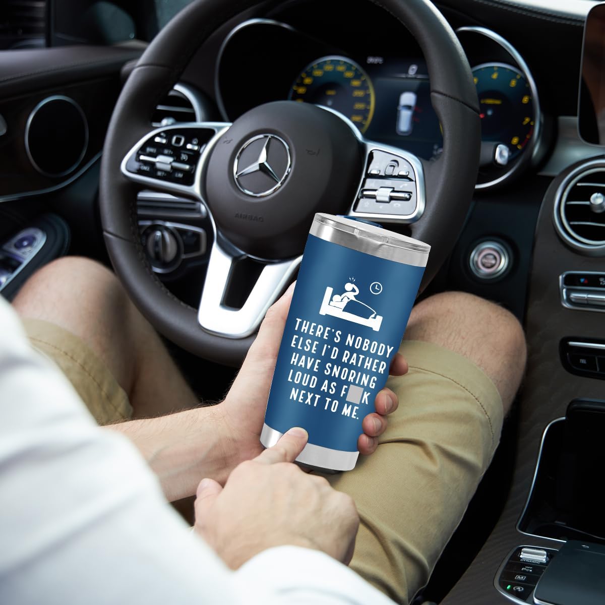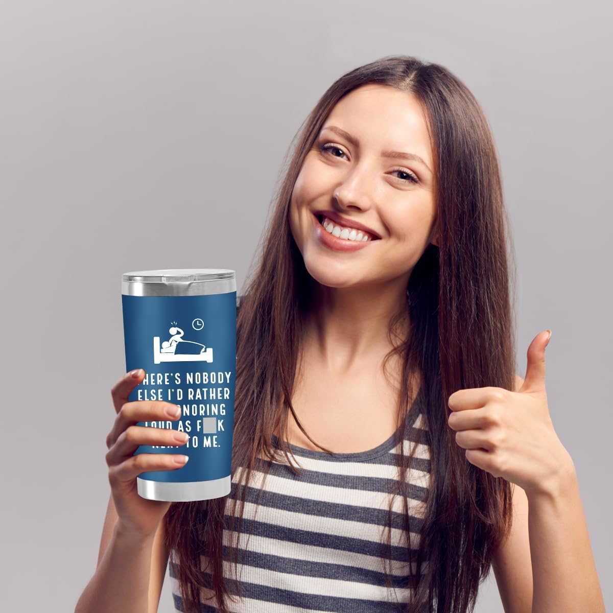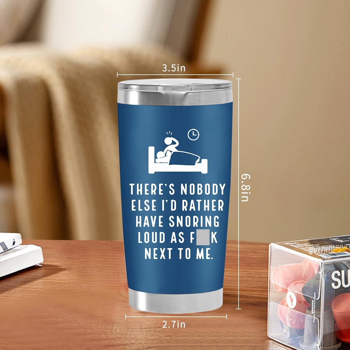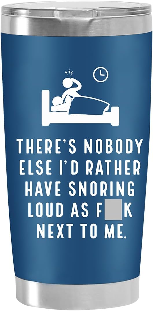 This unique blue stainless steel tumbler is not just a drinkware item; it's a statement of affection and humor. Adorned with the playful message, "There's Nobody Else I'd Rather Have Snoring Loud As F**k Next To Me," this tumbler captures the essence of intimate, light-hearted relationships. Its vibrant blue hue and bold inscription make it an eye-catching piece for any beverage, whether it's coffee in the morning or a refreshing drink on a leisurely evening.