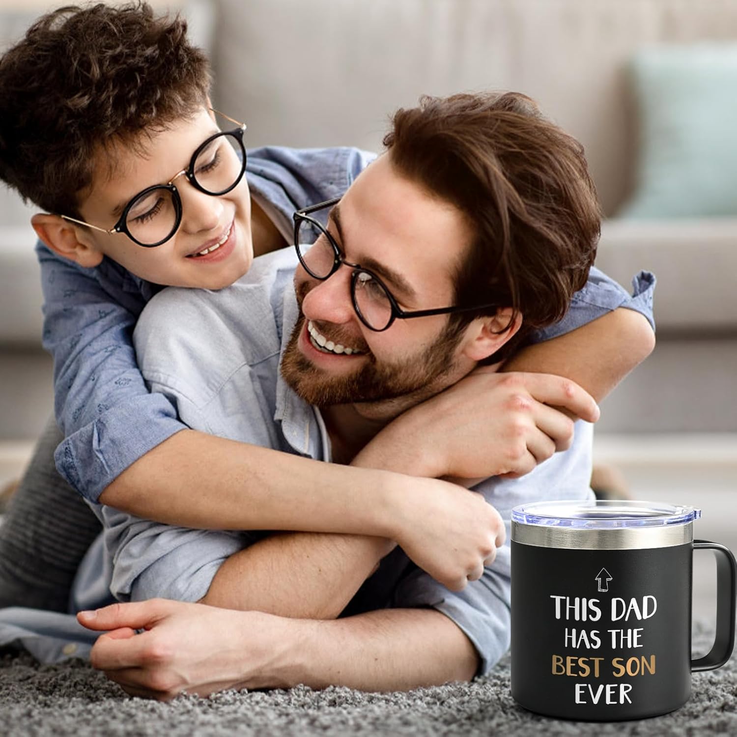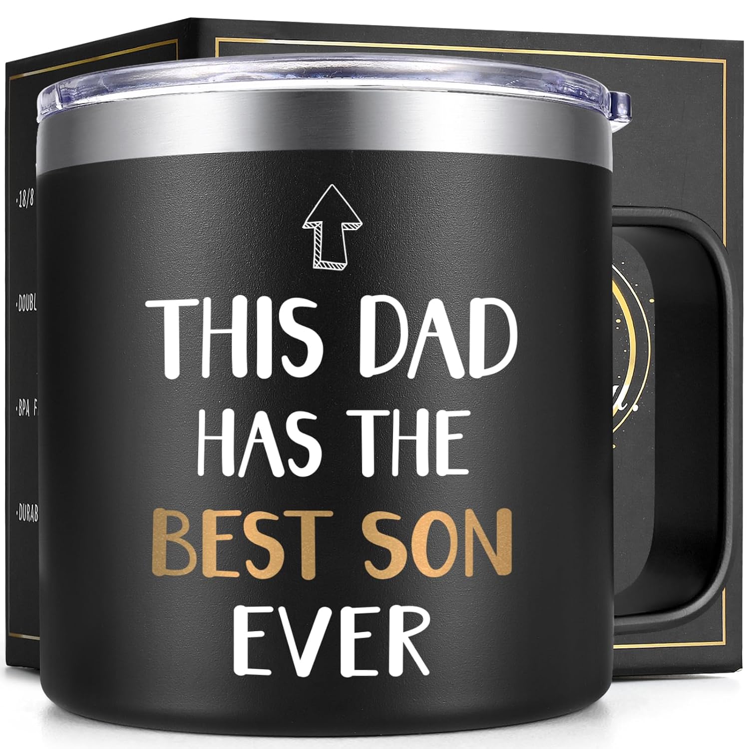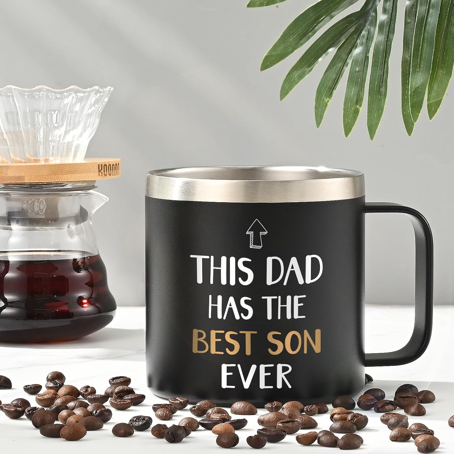 Show your dad how much he means to you with our special Father's Day 14 oz insulated coffee mug. Crafted from durable 304 18/8 food-grade stainless steel, this mug features a unique inscription, "This Dad Has The Best Son Ever," making it not just a beverage container but a cherished keepsake. Perfect for keeping drinks hot for 4 hours or cold for 10 hours thanks to its advanced double-wall insulation technology. This mug comes with a comfortable ergonomic handle, ensuring a secure grip even when full. Packaged thoughtfully with a lid, straw, cup brush, and straw brush in a beautiful gift box, it's ready to be gifted for any occasion, be it Christmas, birthdays, or just because. Whether sipping coffee at home or enjoying a cold beverage outdoors, this mug is a versatile and meaningful gift that celebrates the bond between father and son.