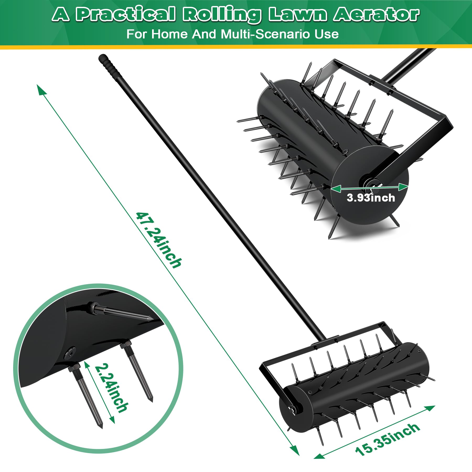 16-inch Rolling Lawn Aerator with 47-inch Adjustable Handle - Heavy Duty Manual Soil Penetrator Spikes for Garden and Yard Maintenance