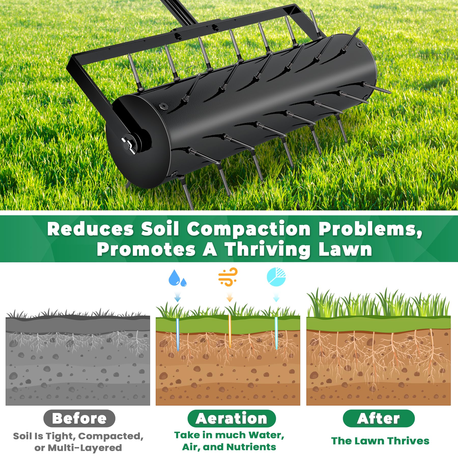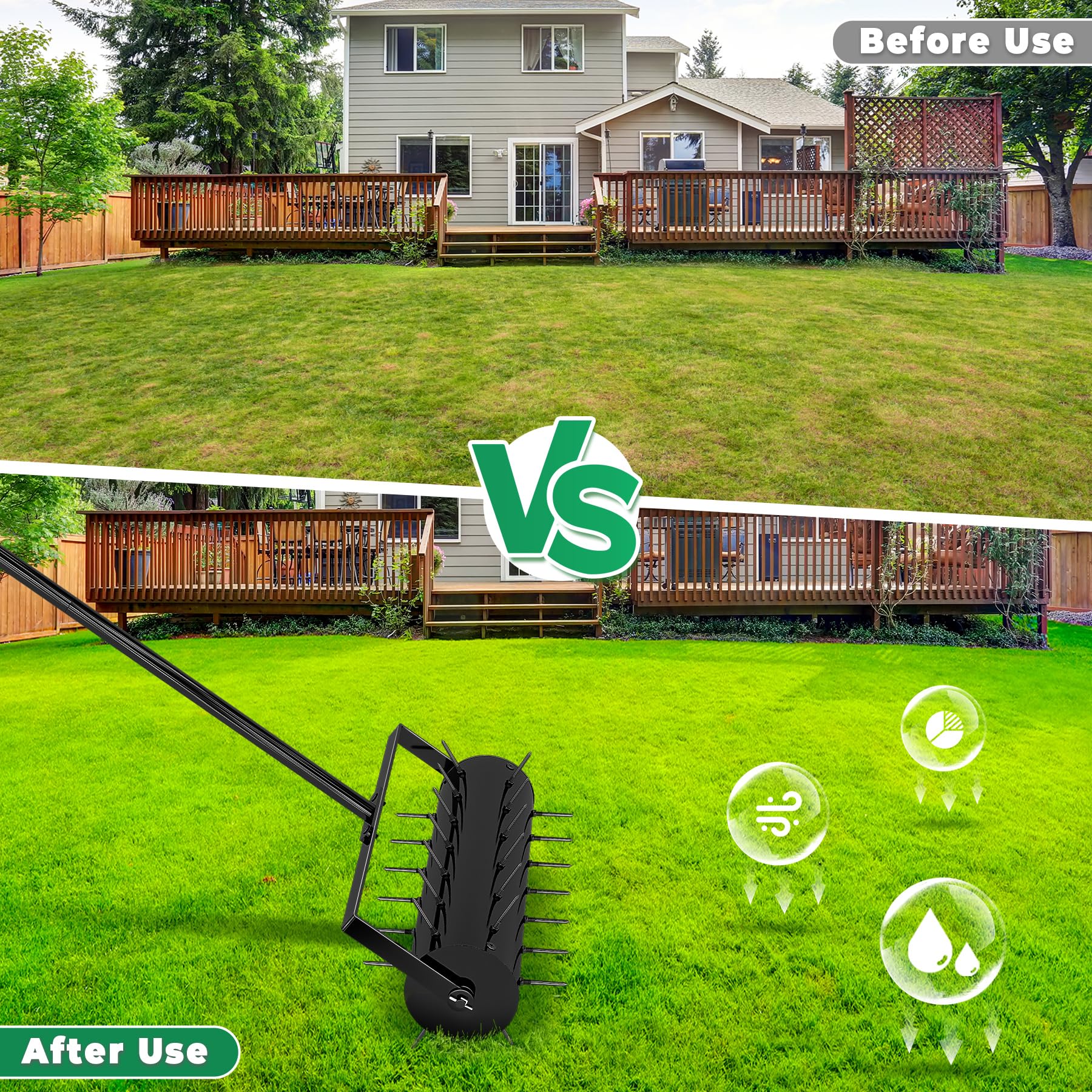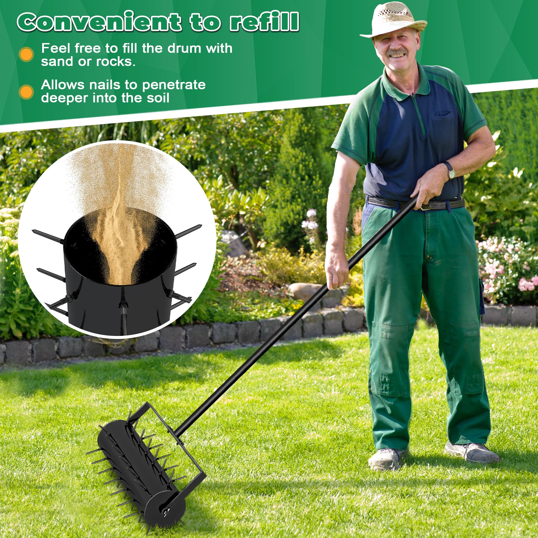 Enhanced Soil Penetration: Equipped with 2.3 in (5.8 cm) heavy-duty spikes, this tool creates deep channels in the soil. For tougher terrain, the drum features a 3.9 in (10 cm) diameter side injection port, allowing you to add sand or stones for extra weight and deeper penetration.