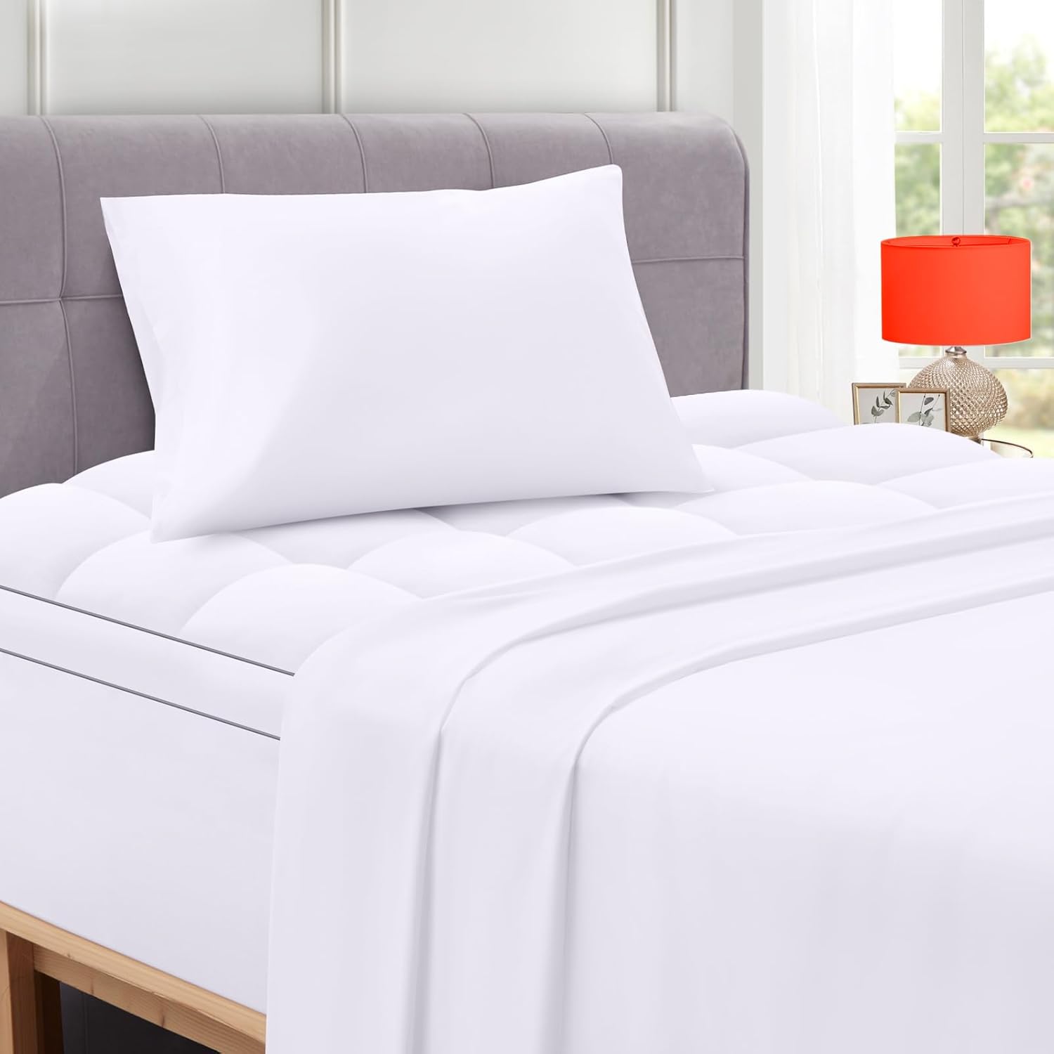 Twin XL Mattress Topper with Flat Sheet & Pillowcase Set - Enhances Comfort and Cooling, White