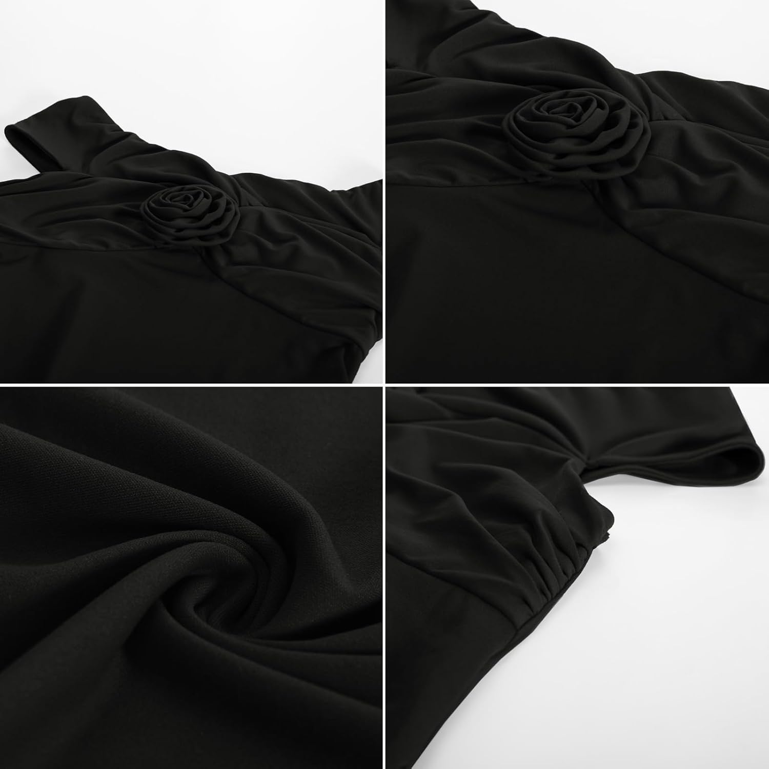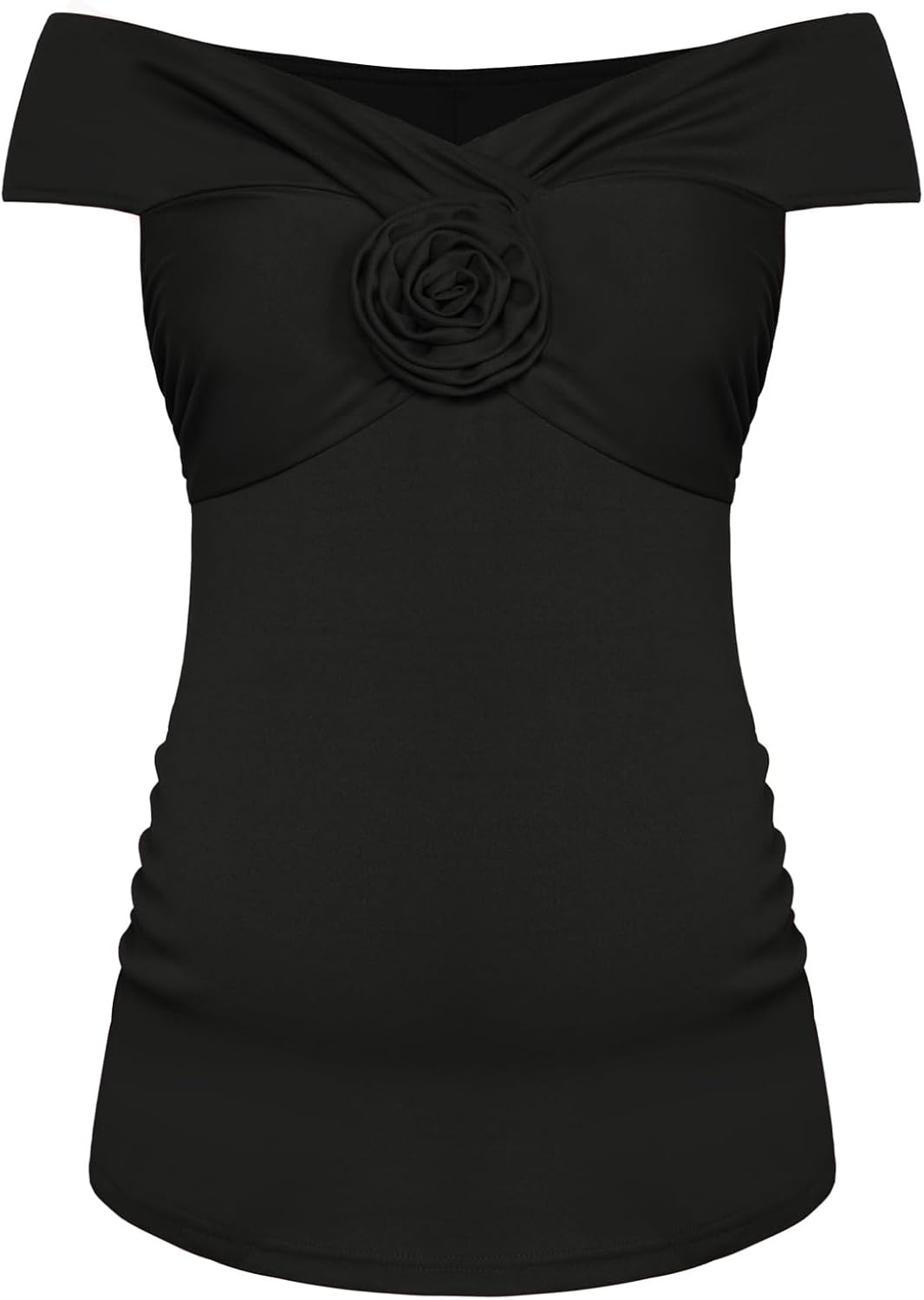 Chic Black Large Maternity Off Shoulder Top with 3D Flowers and Side Ruching - Fits Throughout Pregnancy