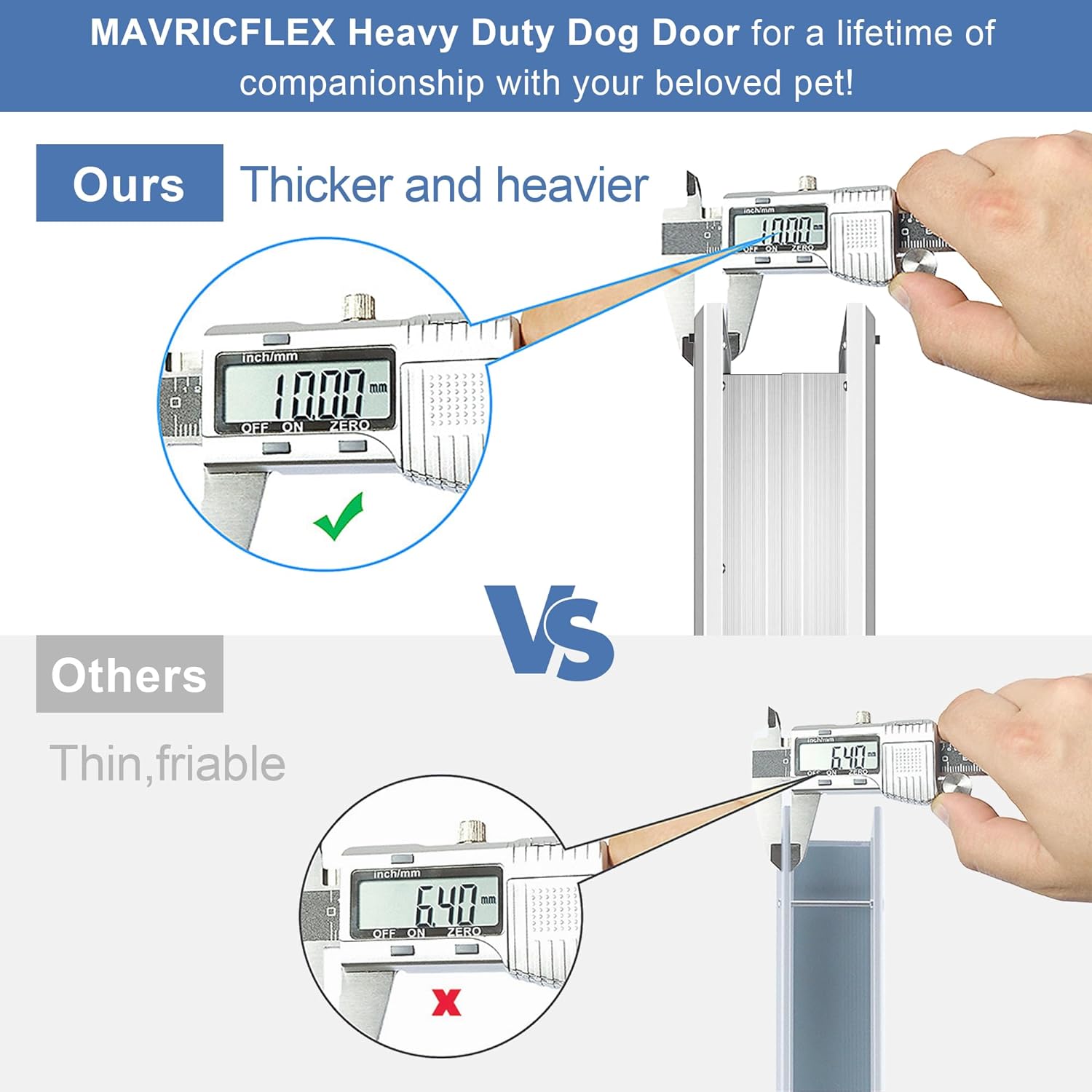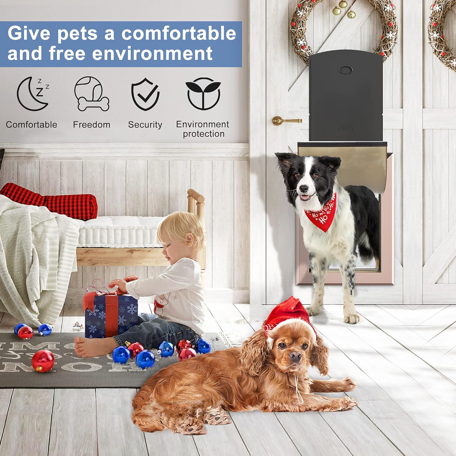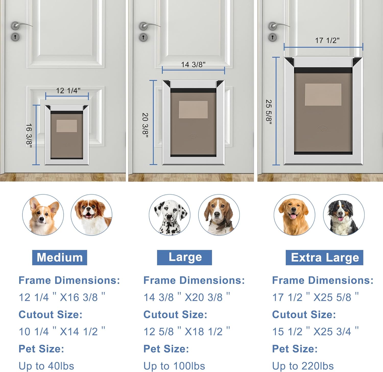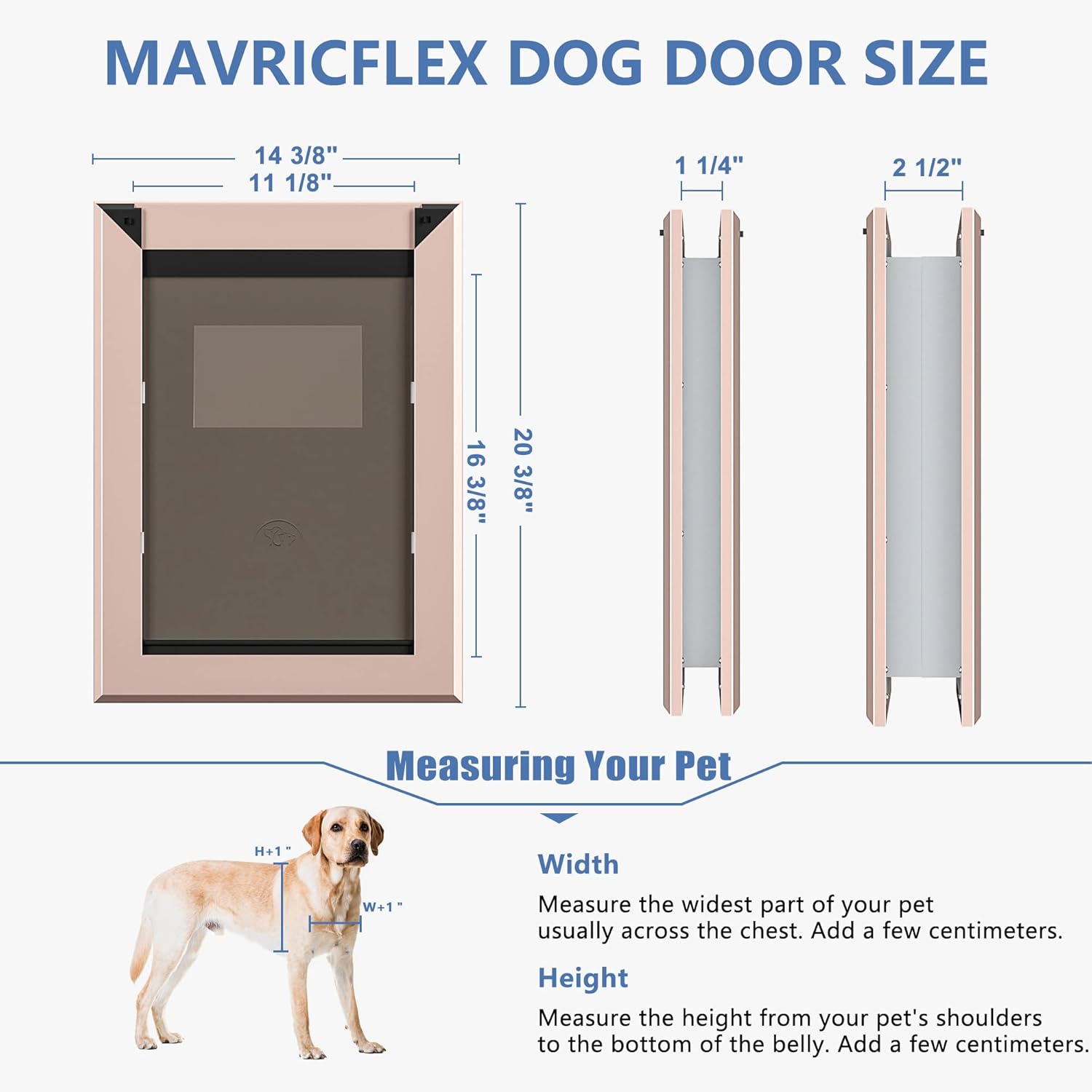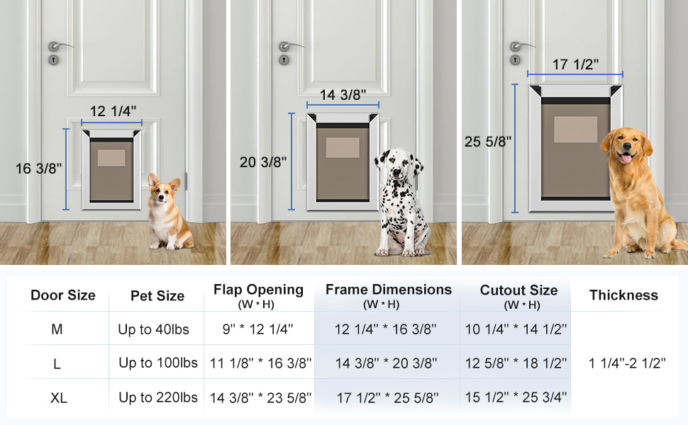 Unlock convenience and security for your pet with the Large Rose Gold Aluminum Dog Door. Designed for large dogs weighing up to 100 lbs, this weatherproof and energy-efficient dog door allows your furry friend the freedom to come and go as they please. Constructed from rugged aviation aluminum alloy, the door resists wear and tear and prevents easy damage from chewing. The door measures 14 3/8'' W x 20 3/8'' H (36.5 cm W x 51.8 cm H) with a flap opening of 11 1/8” W x 16 3/8'' H (28.3 cm W x 41.6 cm H), accommodating pets comfortably. It fits a variety of door types including paneled, wood, PVC, and metal, ranging from 1/4'' to 2 1/2'' (0.6 cm to 6.4 cm) in thickness. Installation is simplified with a detailed cut-out template and step-by-step instructions. A double sliding lock panel enhances security and energy conservation, protecting your home from extreme weather while reducing energy loss.