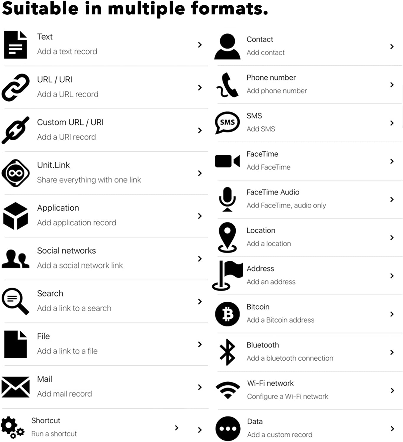 What makes these cards truly unique is their comprehensive data compatibility. They support over 20 different data formats, including URL, contact details, phone numbers, SMS, Facetime, location, social networks, emails, files and much more. Virtually everything you need for your everyday business and entertainment networking can be conveniently written into the card, providing a seamless bridge between your online and offline worlds.