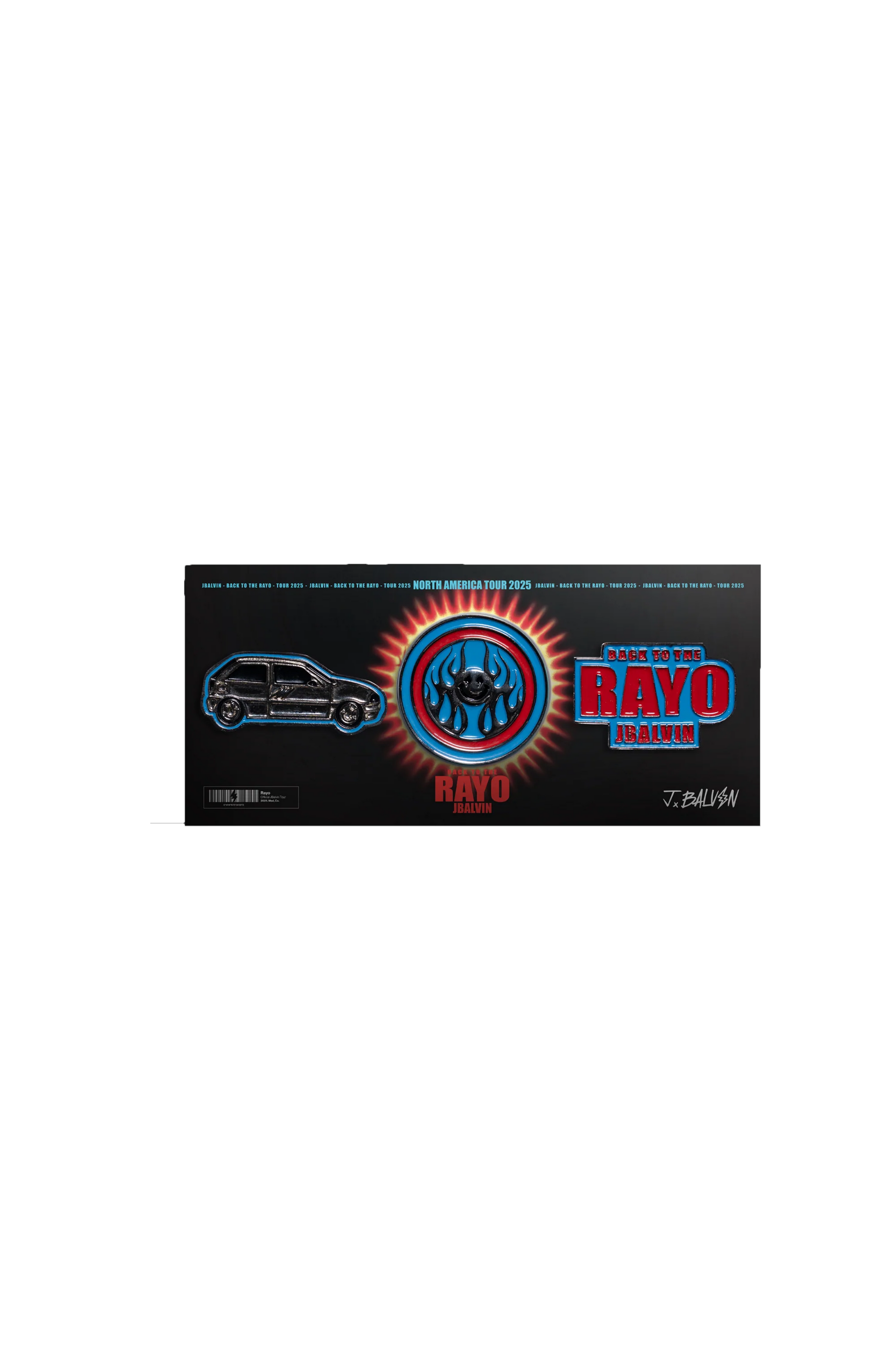 Add a piece of the high-voltage energy from the J Balvin Rayo Tour to your personal collection. This three-piece pin set is designed with a retro-futuristic VHS aesthetic, blending industrial graphics with vibrant, modern style to symbolize power and transformation.