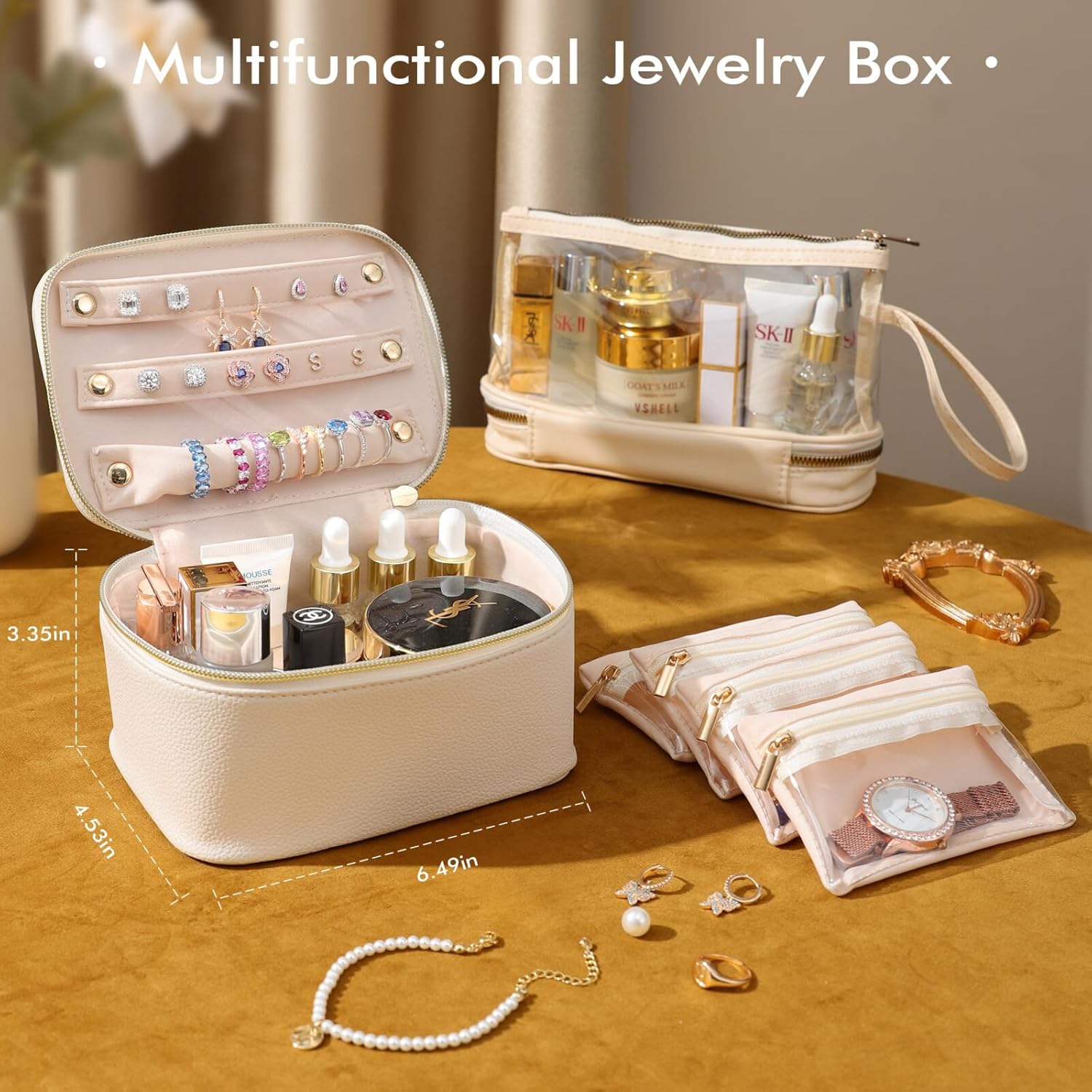 Sized at 6.49x4.53x3.35 inches (16.5x11.5x8.5 cm), this multifunctional box not only holds your jewelry but also fits essential cosmetics, from lipstick to foundation. It includes eight velvet pouches perfect for organizing various jewelry like necklaces, bracelets, rings, and watches. These pouches are exceptionally lightweight and fit effortlessly into your luggage or purse, making them ideal for travel or home storage.