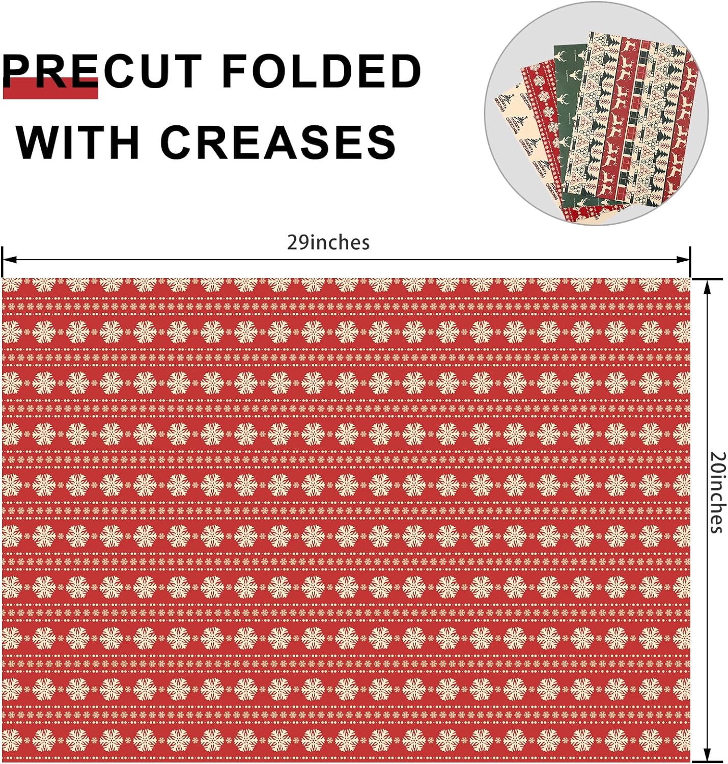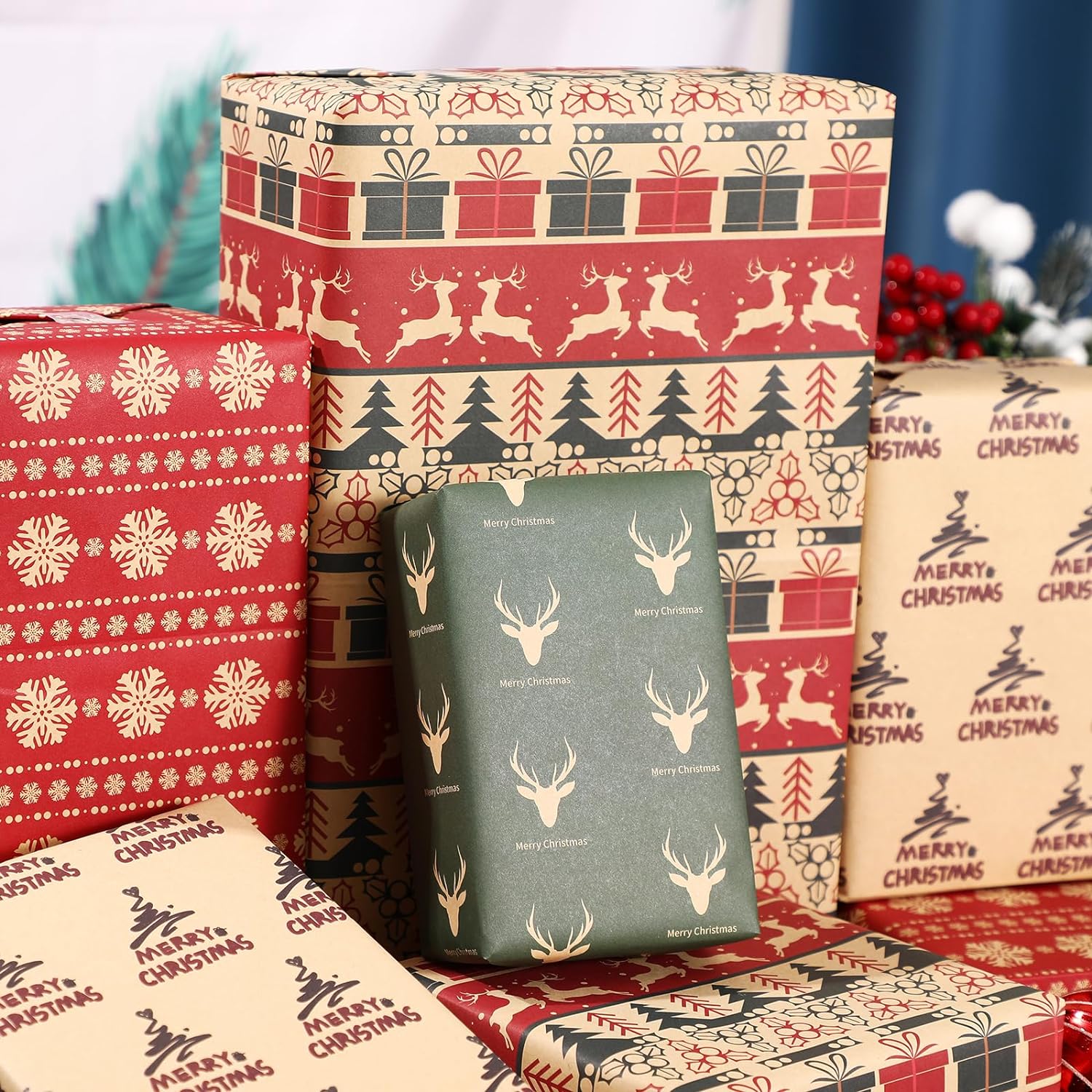 Premium Christmas Wrapping Paper Set - 12 Sheets of Kraft Paper with Festive Red & Green Designs, 20x29" Each for Holiday Gifts