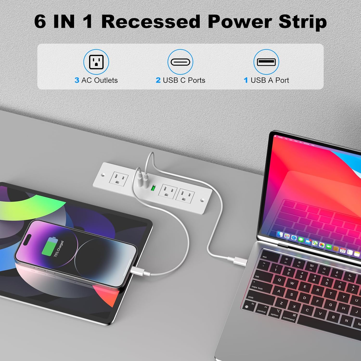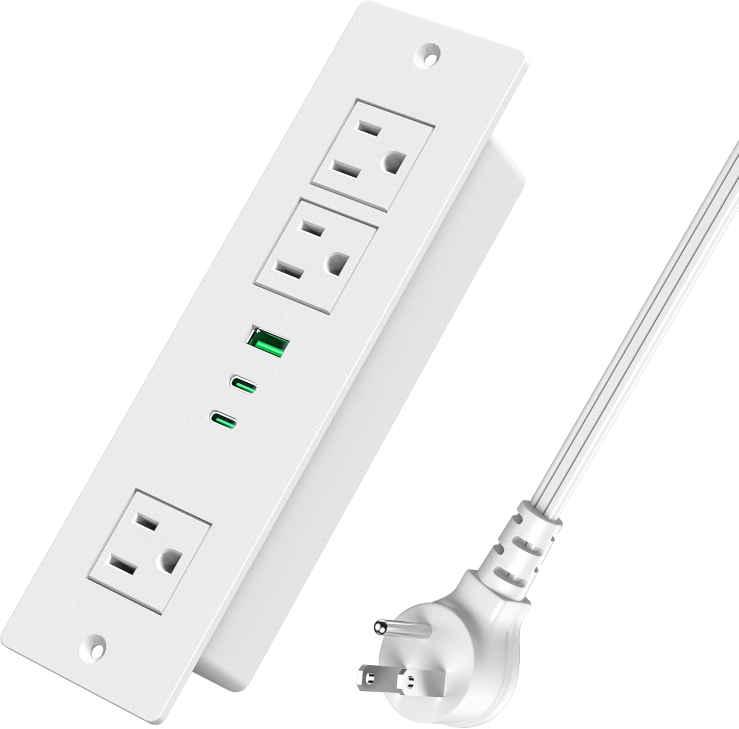 Recessed Power Strip USB C with 30W Delivery - 6FT Cable, 3 Outlets & 2 USB-C