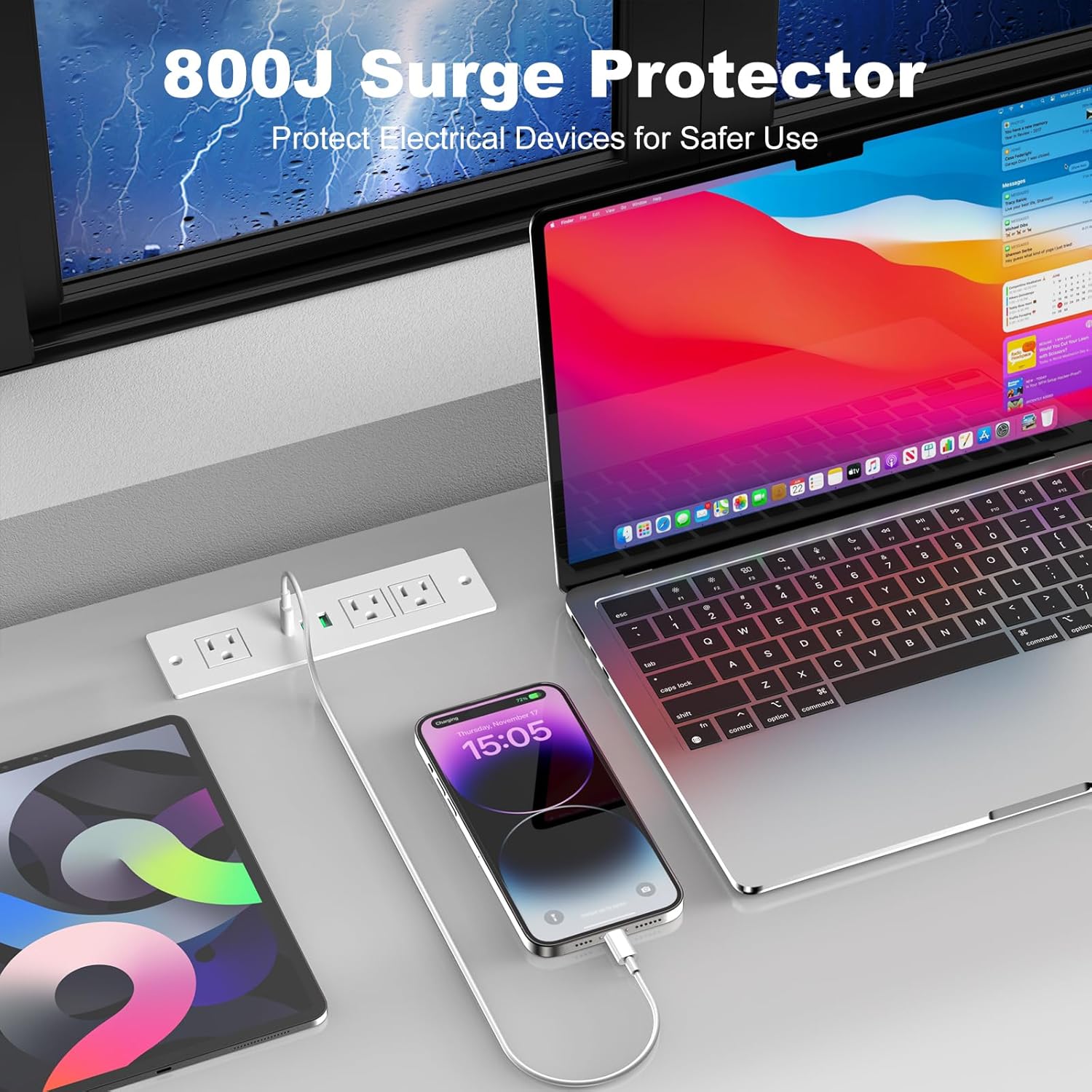 Safety is paramount, which is why this power strip is equipped with built-in 800J surge protection. This feature shields all connected electronics from potential damage caused by voltage spikes and power surges, ensuring durability and longevity of your devices during unexpected power fluctuations, even in stormy weather conditions.