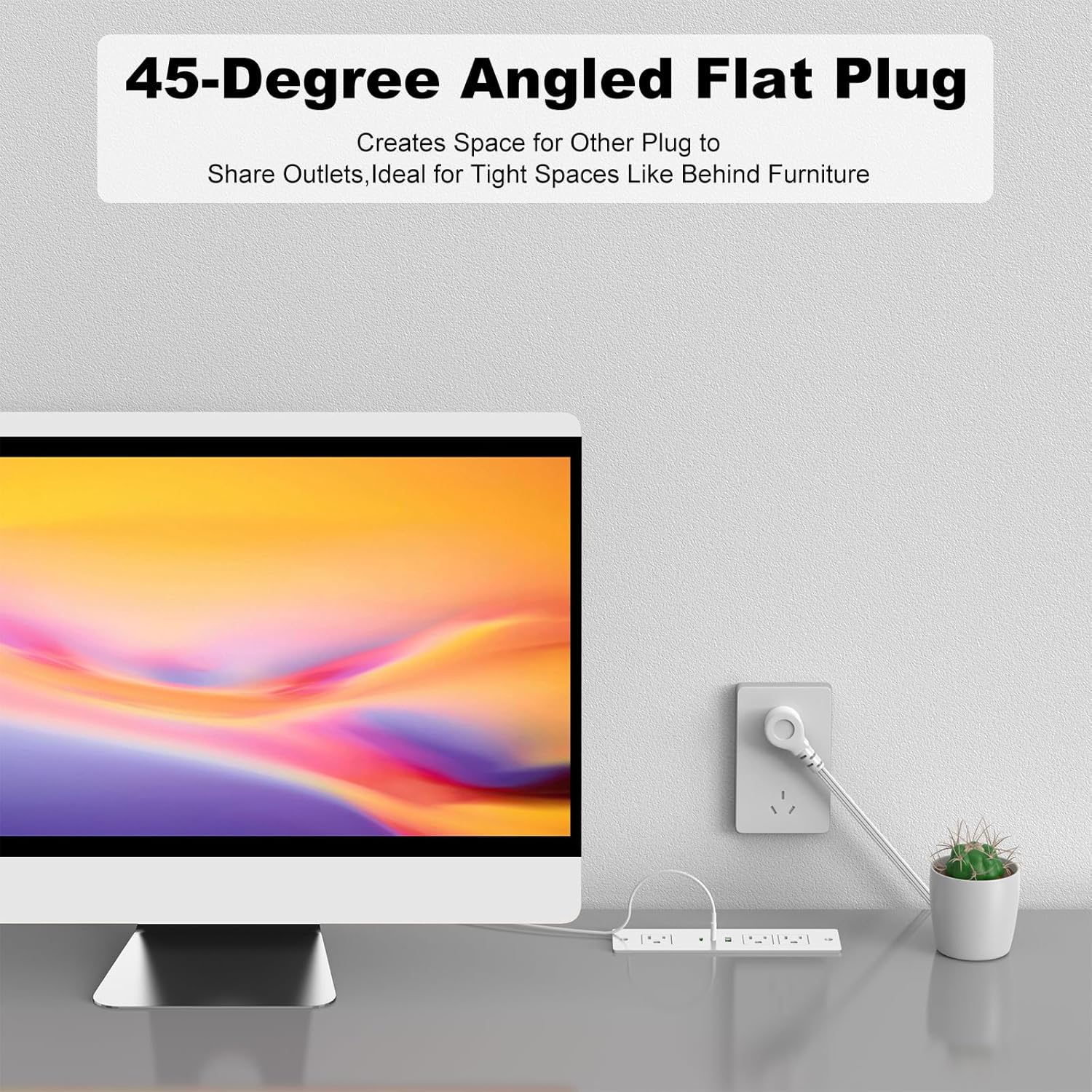 The dimensions of the mounting hole required for installation are 6.37 inches in length and 1.8 inches in width (16.2 cm x 4.6 cm). It includes a 6-foot (1.83 meters) power cable which offers flexibility in placement and ensures that you can reach your nearest power source with ease. This model's design also includes a widely spaced outlet to accommodate larger plugs, enhancing its utility on your desktop.
