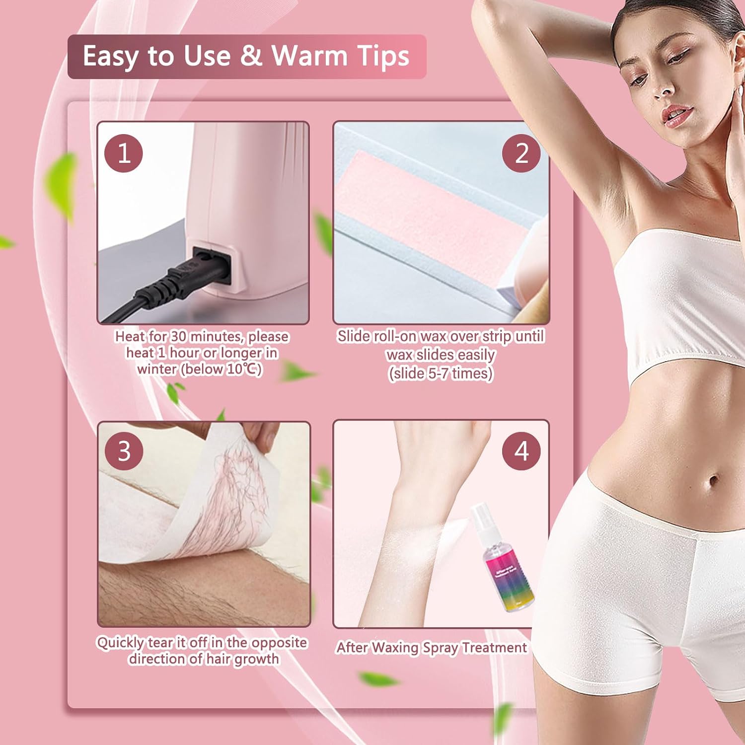 Please keep in mind, if the temperature is below 50°F, the wax may require over an hour to melt fully. For best results, roll the melted wax strip on wax paper several times for even coverage. To avoid burns, do not apply wax directly to the skin. Use the after-wax treatment spray included in the kit to soothe your skin and remove any wax residue after hair removal, enhancing your waxing experience without an applicator.